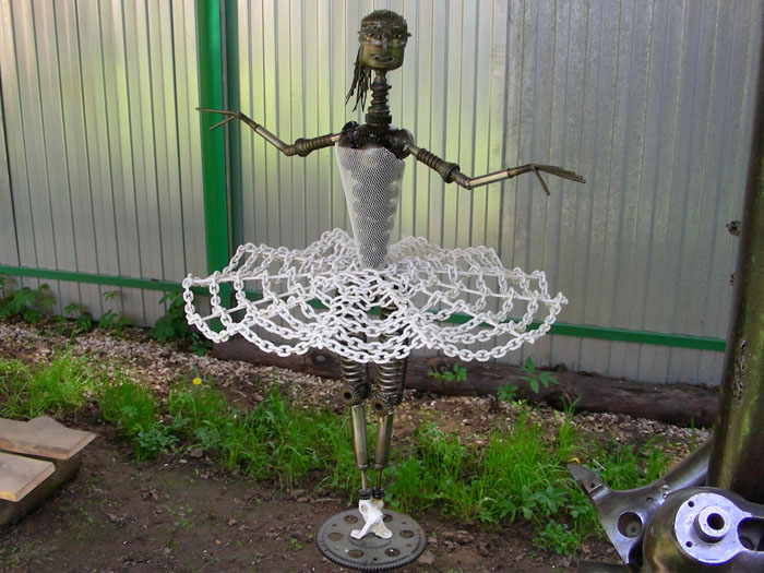 Балерина. Электрик. Практически Чубайс. Свечи, пружины. Все в дело. А вот тележка. Просто тележка, но надо же было так придумать. Вот что значит, человек дружит с техникой!! Я только рот успевала прикрывать. А вот еще пес, динозавр, муравей поднимающий бокал. Надо же так придумать. Сам Сергей мастер по дереву. Позже стал комбинировать. Как я поняла, он с детства мастерил что-нибудь, мама его каждый раз спрашивала: куда же ты это ставить будешь? Следовал ответ - на телевизор. Говорит сейчас на телевизоре ничего нет. Жаль нельзя увидеть его детских поделок.