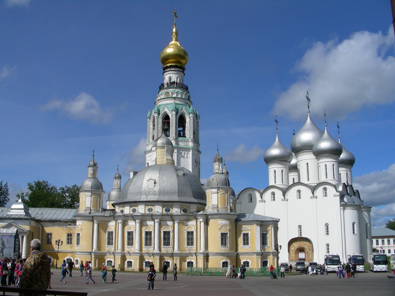 А мы дальше спешим на площадь к Кремлю, о которой многократно читала в различных описаниях. Только непродвинутые туристы называют этот комплекс Кремлем. Хотя очень похож, но все ж таки это Архиерейское подворье, резиденция вологодских епископов на протяжении трехсот лет. Величественный и непостижимый, словно корабль пришельцев, Софийский собор. Вообще городов, где существуют храмы, посвященные Святой Софии всего пять: Киев, Москва, еще два и Вологда. Воздвигать соборы во имя Софии свойственно людям с достаточно зрелым духовным чутьем. Ведь София – сложное, до сих пор не до конца разработанное в богословской науке, понятие. Это мудрость, но премудрость одушевленная, которая сама о себе в Библии говорит – «Господь создал меня в начале Своих путей». Из трудов русских теологов 20-го века можно уяснить, что София, в первом приближении, есть мысль Творца о мире, первоначальный чертеж творения, постепенно реализуемый во времени и пространстве.