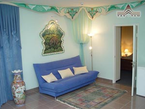 - VIP трехкомнатный "Воспоминание о Египте": Вы не боитесь соседства с фараоном? А может быть у Вас одинаковые с ним вкусы? Вы так же любите роскошь и золото, и Вы понимаете ценность настоящих папирусов. Древние письмена на глиняных дощечках и Вас, как главное сокровище, стерегут два каменных льва; телевизор (7 каналов), телефон, просторный гардероб, универсальный стол, удобное рабочее место, 2 кровати queen size, мини-бар, ковровое покрытие, удобная современная мебель, подогреваемый пол, отделка стен натуральным камнем, новая современная сантехника, 2 балкона; уборка номера 1