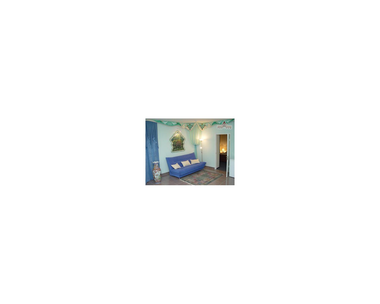 -VIP трехкомнатный "Ода Башкирии": стены, двери, потолки покрыты ручной росписью, белоснежная мебель с азиатскими акцентами, богатые драпировки позволяют почувствовать себя частью башкирских просторов, хозяином несметных табунов лошадей; богатырем, черпающим здоровье в водах горных рек и ароматах башкирского меда; телевизор (7 каналов), телефон, просторный гардероб, универсальный стол, удобное