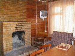 Две 2-х местные спальни + комната отдыха с камином и мягкой мебелью, ТВ. В доме санузел, душ, оборудованная кухня (электроплита, электрочайник, холодильник, посуда, горячая и холодная вода).