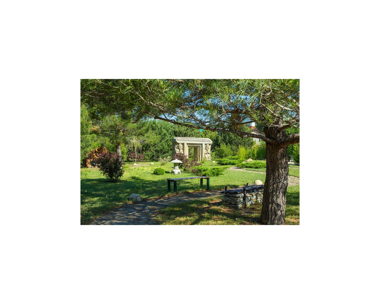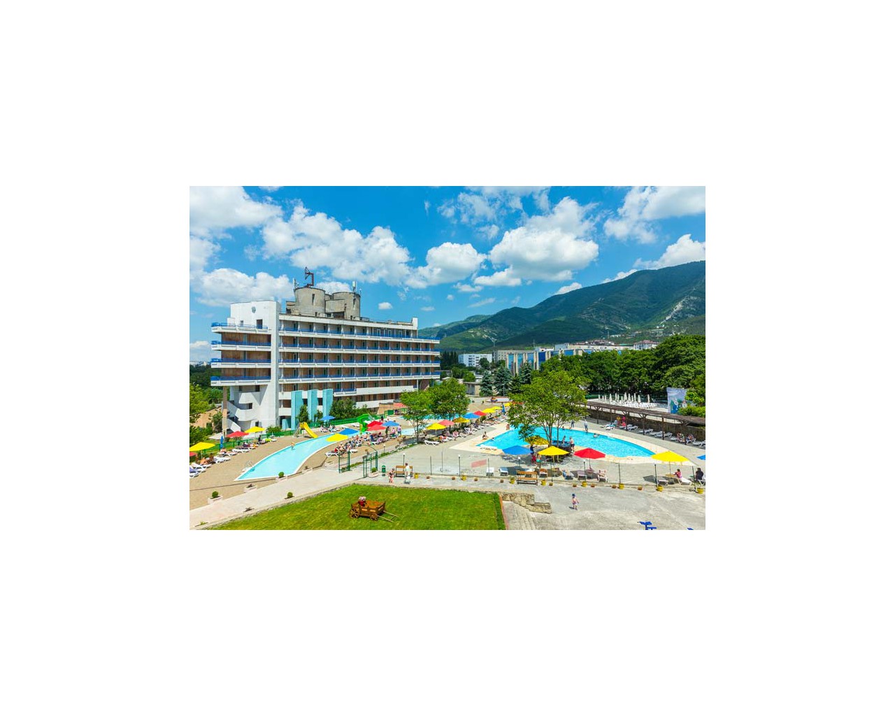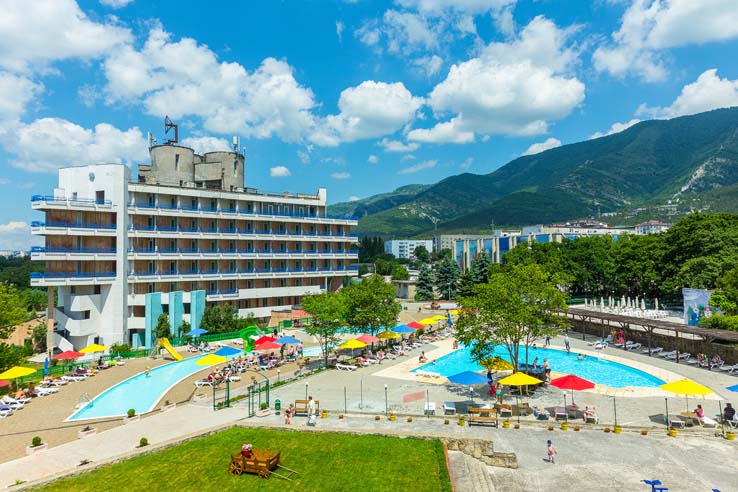 Пляж: собственный, в (300 м от пансионата, оборудован пирсами и соляриями, для детей - специальный детский пирс с отдельной купальней.
