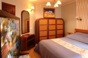 1-комн., двуспальная кровать, ТВ плазменный, DVD-проигрыватель, Х, К, ТФ, 2 маленьких балкона, журнальный столик, диван-кресло, стол, стулья, сейф, в коридоре - шкаф, мебель Италия.