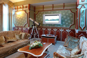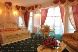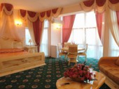 - Люкс 2 комнатный над рестораном 4 этаж: двуспальная кровать, телевизор плазменный, телевизор, ТФ, 2 К, мини-бар, раскладной диван, одна комната проходная, балкон с ротанговой мебелью, сейф, западная и восточная сторона, вид на гору Ай-Петри и бассейн или на море.