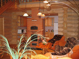 - этаж № 1 – гостиная с камином, телевизор (около 45 спутниковых программ),караоке, балкон с видом на Онежское озеро, спальня, кухня, санузел с ванной и душем.