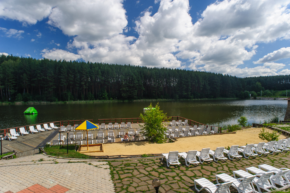 Не теряя времени мы переоделись и отправились загорать на пляж у лесного озера. Пляж оборудован прекрасно. Лежаки расположены в нескольких зонах: прямо на понтонах на воде и на берегу под защитой от ветра. На воде есть водные велосипеды и плавучие островки, на которые можно взбираться и нырять с них.