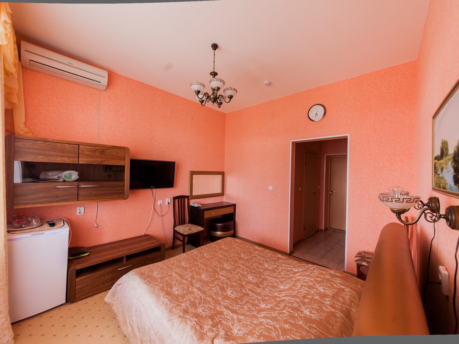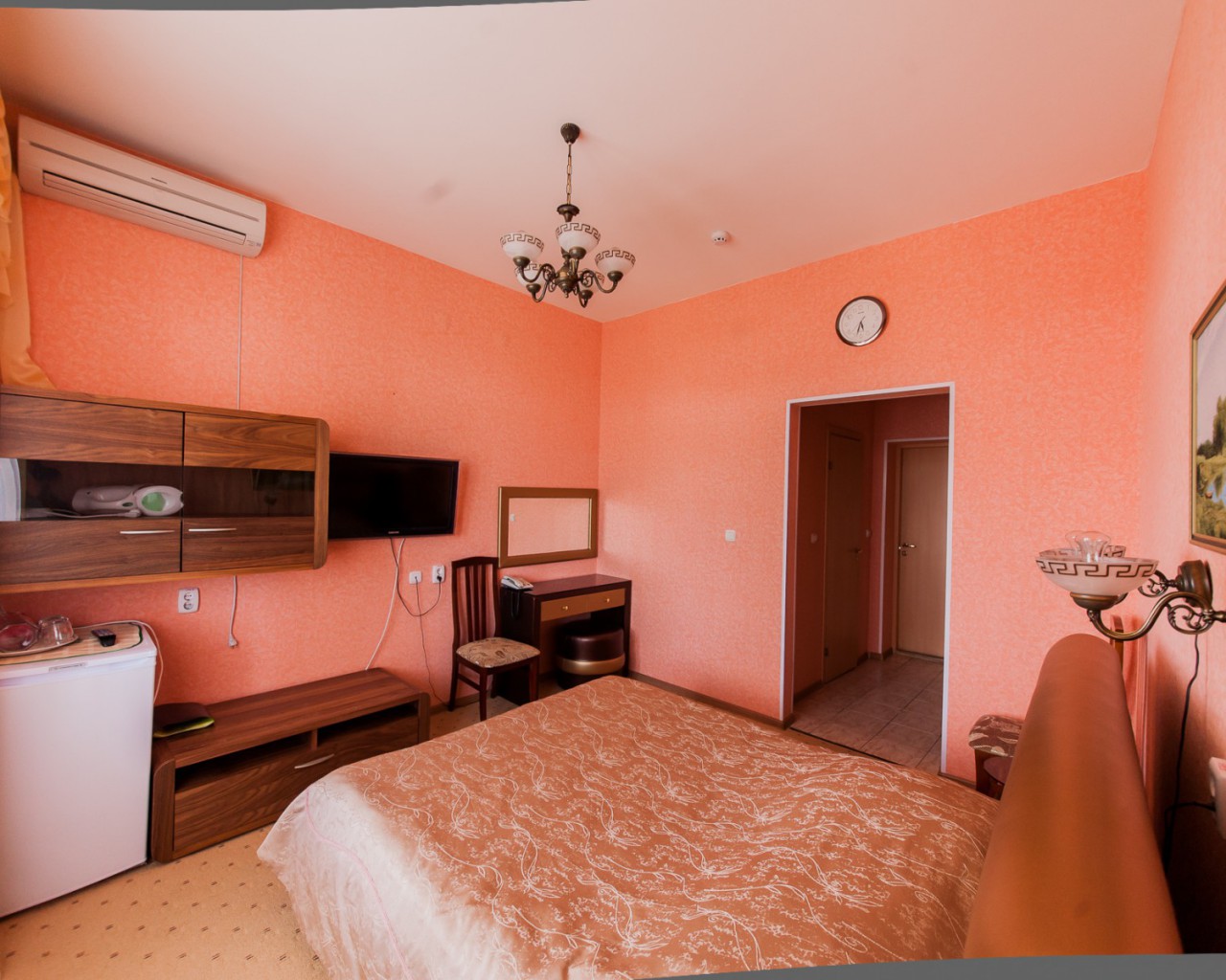- Комната: двухспальная кровать (140*200), телефон, телевизор, холодильник, тумба прикроватная, комод, бра, стул, часы настенные, картина,графин со стаканами.