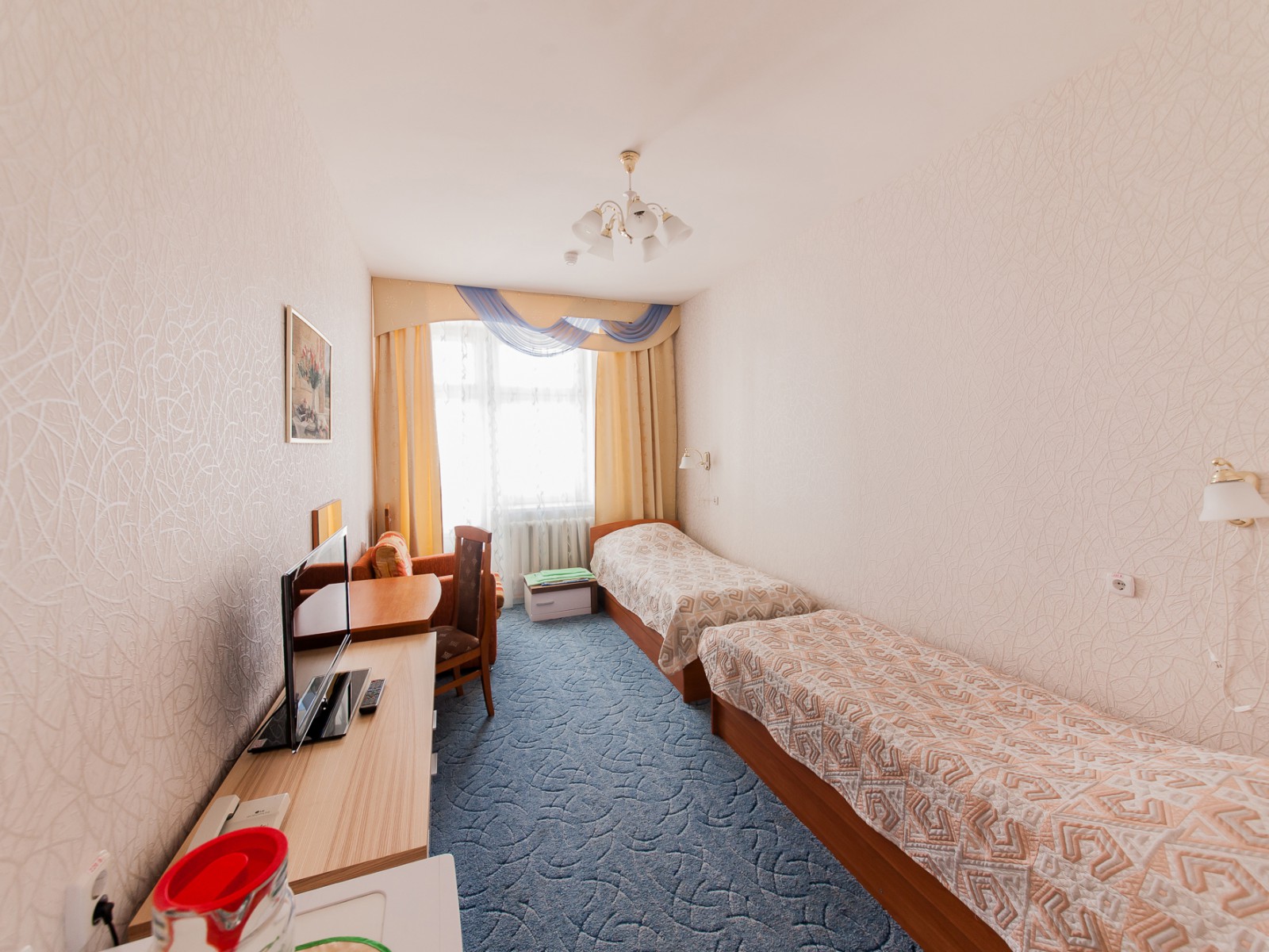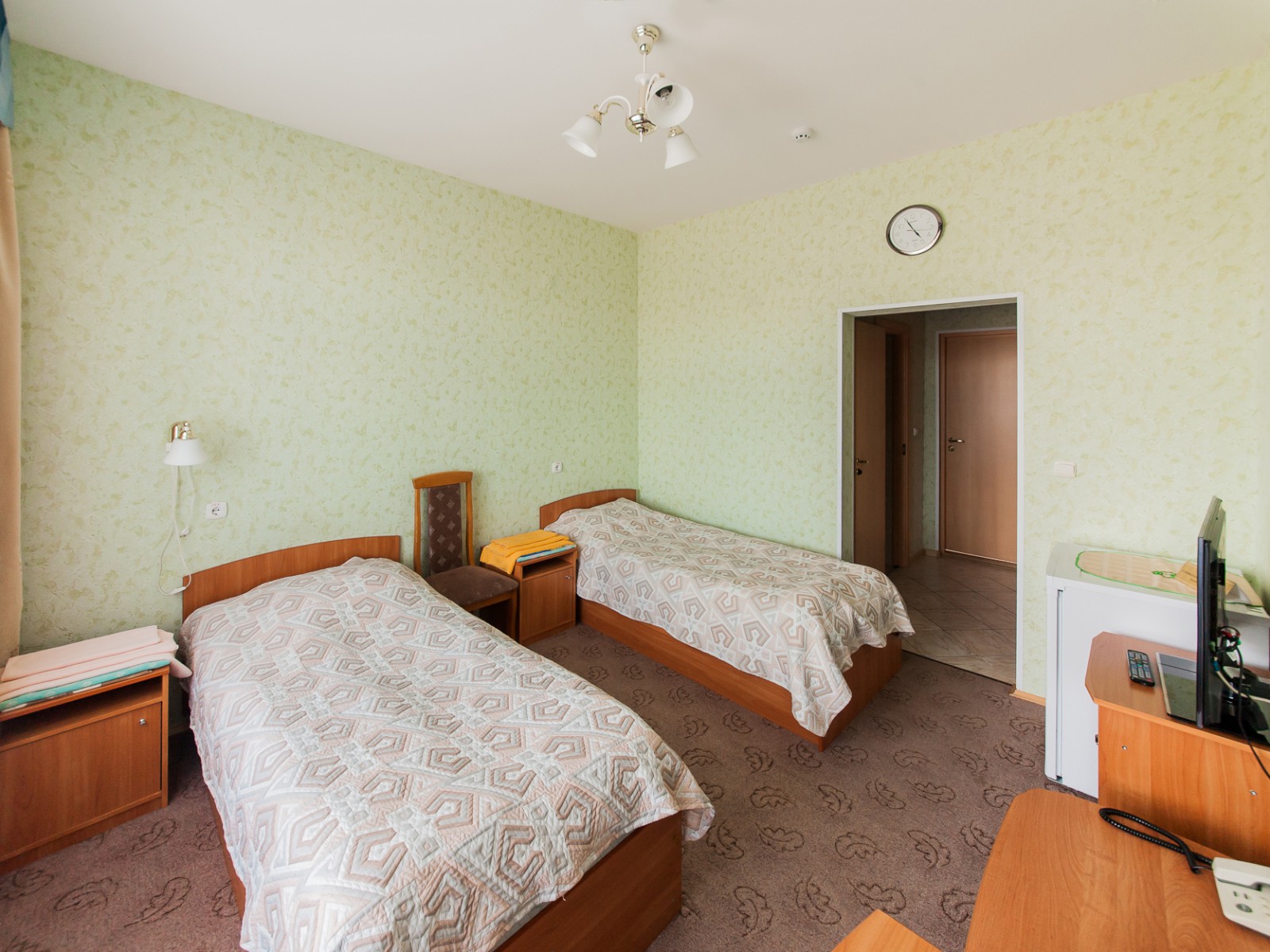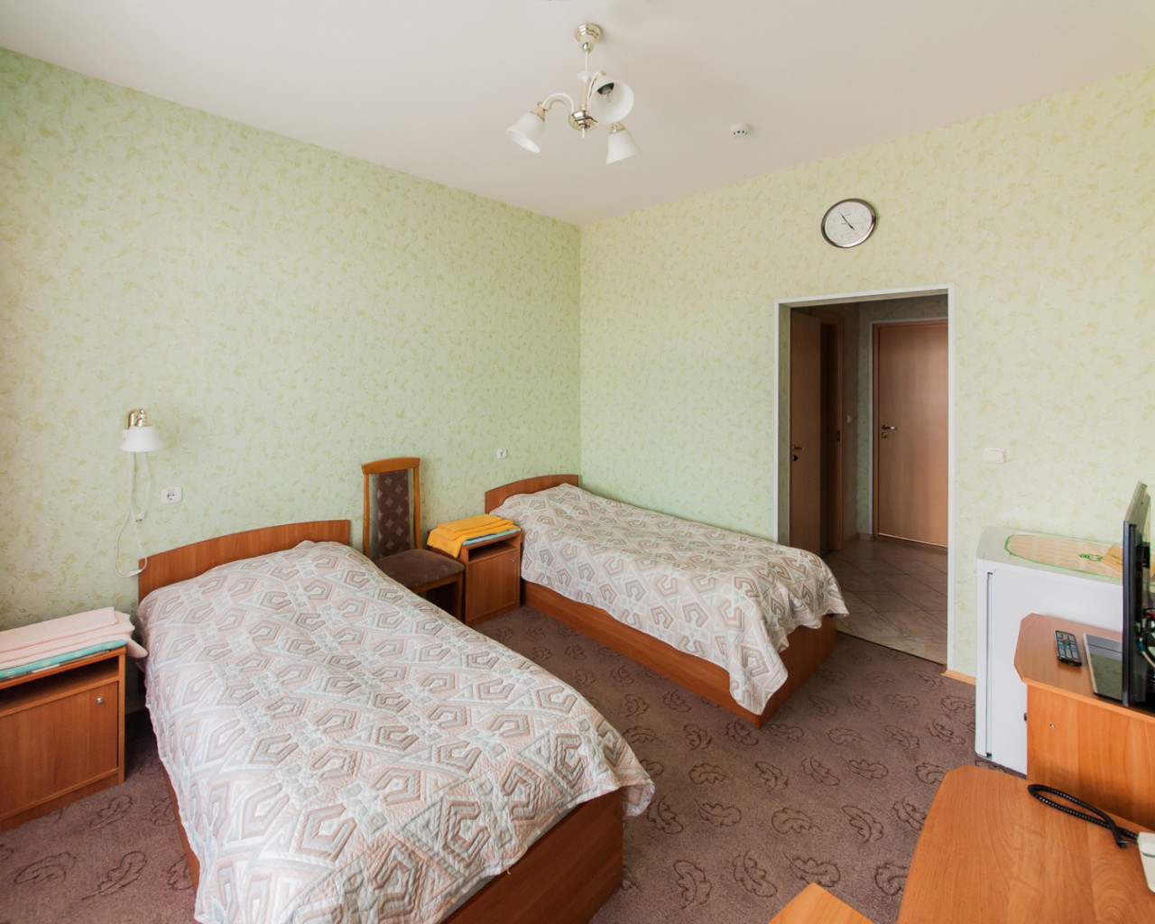 - Комната: 2 двухспальных кровати (140*200) , телефон, телевизор, холодильник, тумба прикроватная, бра, стул, часы настенные, графин со стаканами,, чайник.