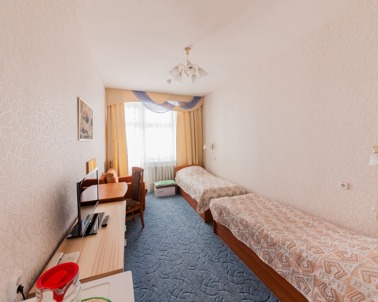 - Комната: две полутороспальные кровати (90*200), телефон, телевизор, холодильник, две тумбы прикроватные, бра, картина, стул, часы настенные, графин со стаканами.