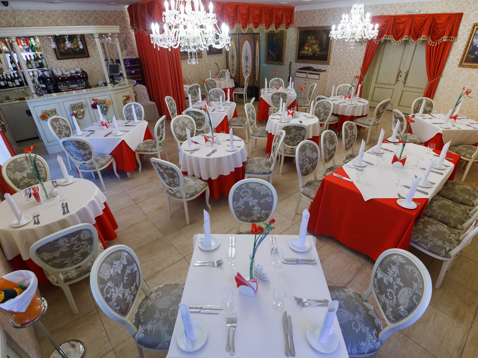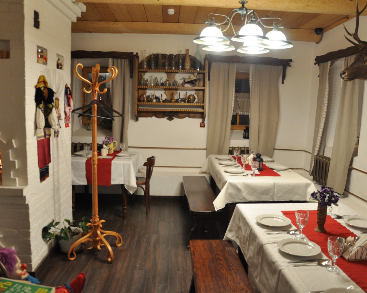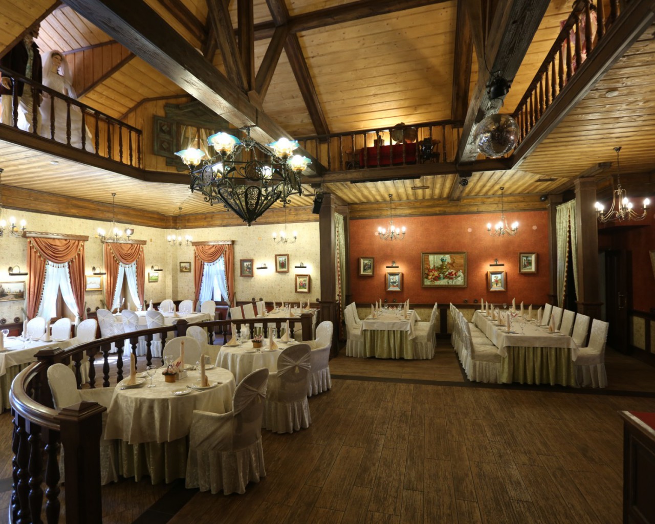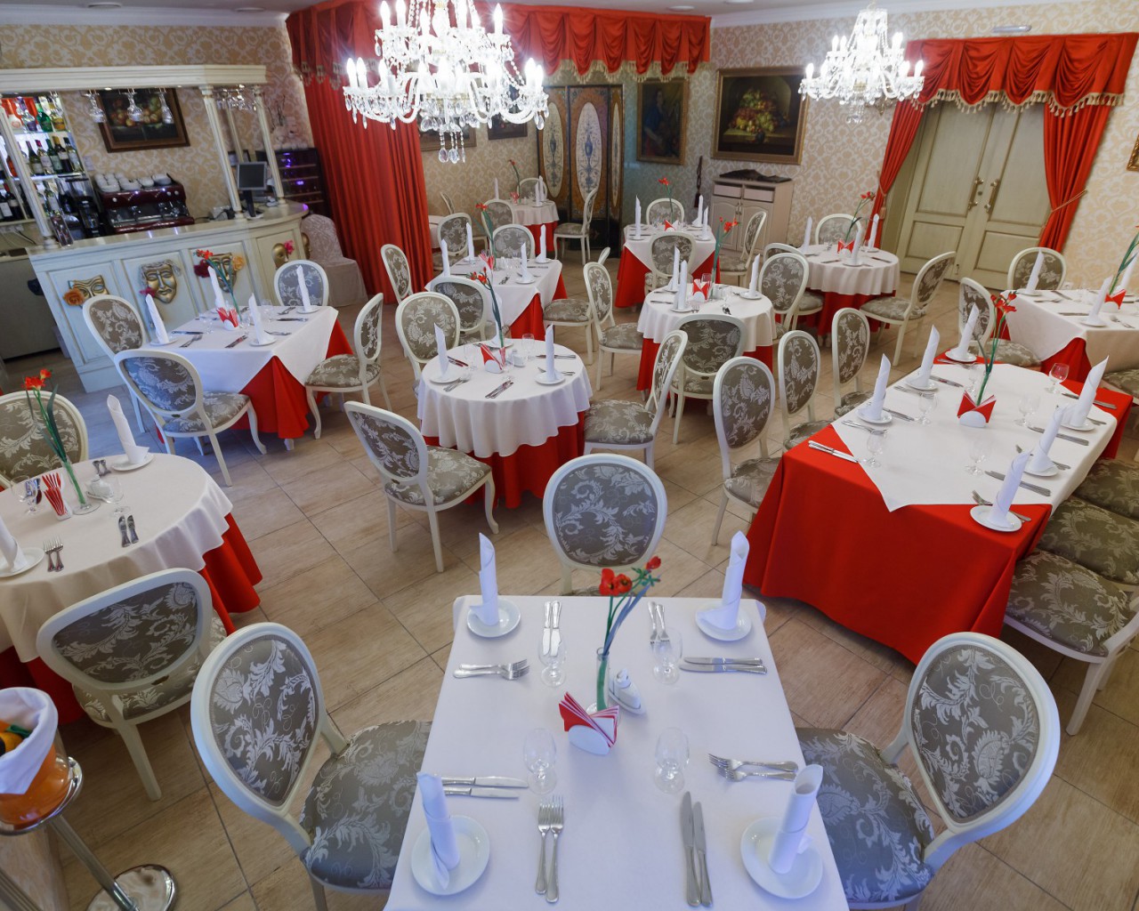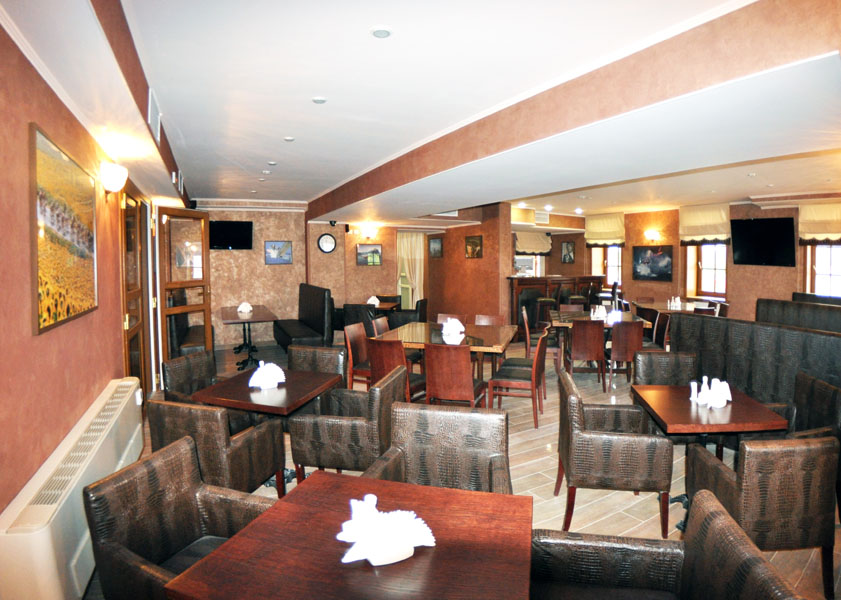 Красный зал ресторана вместимостью до 50 человек приглашает гостей на трапезу в уютной обстановке.