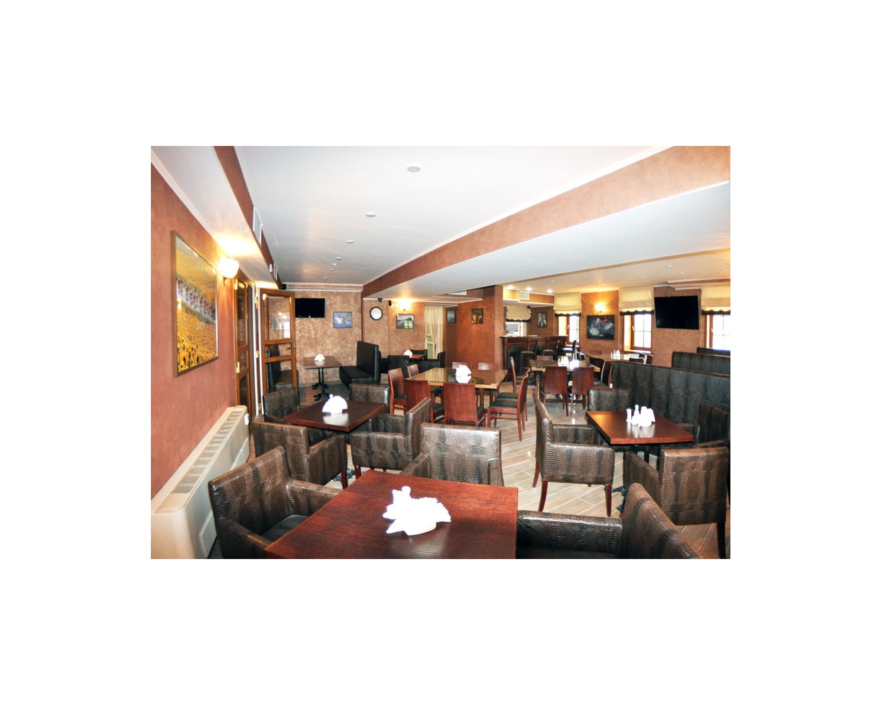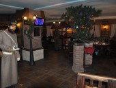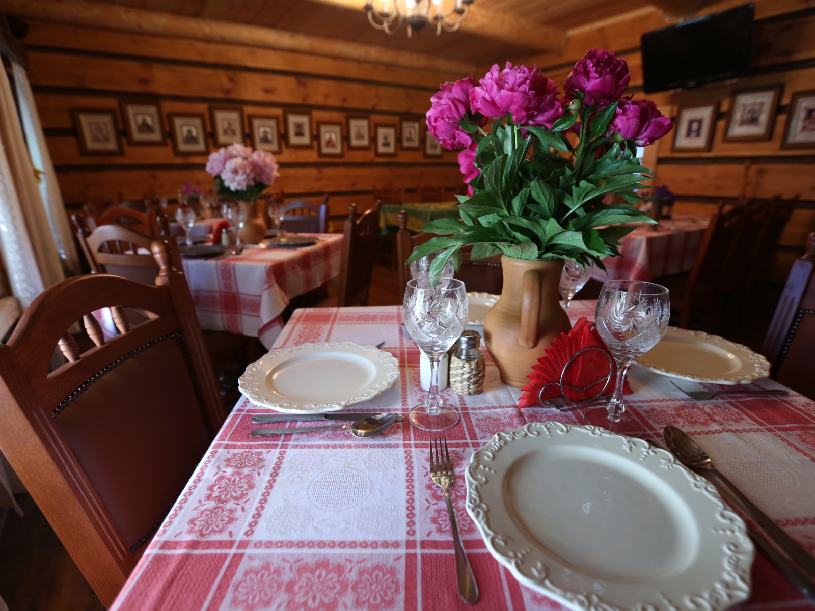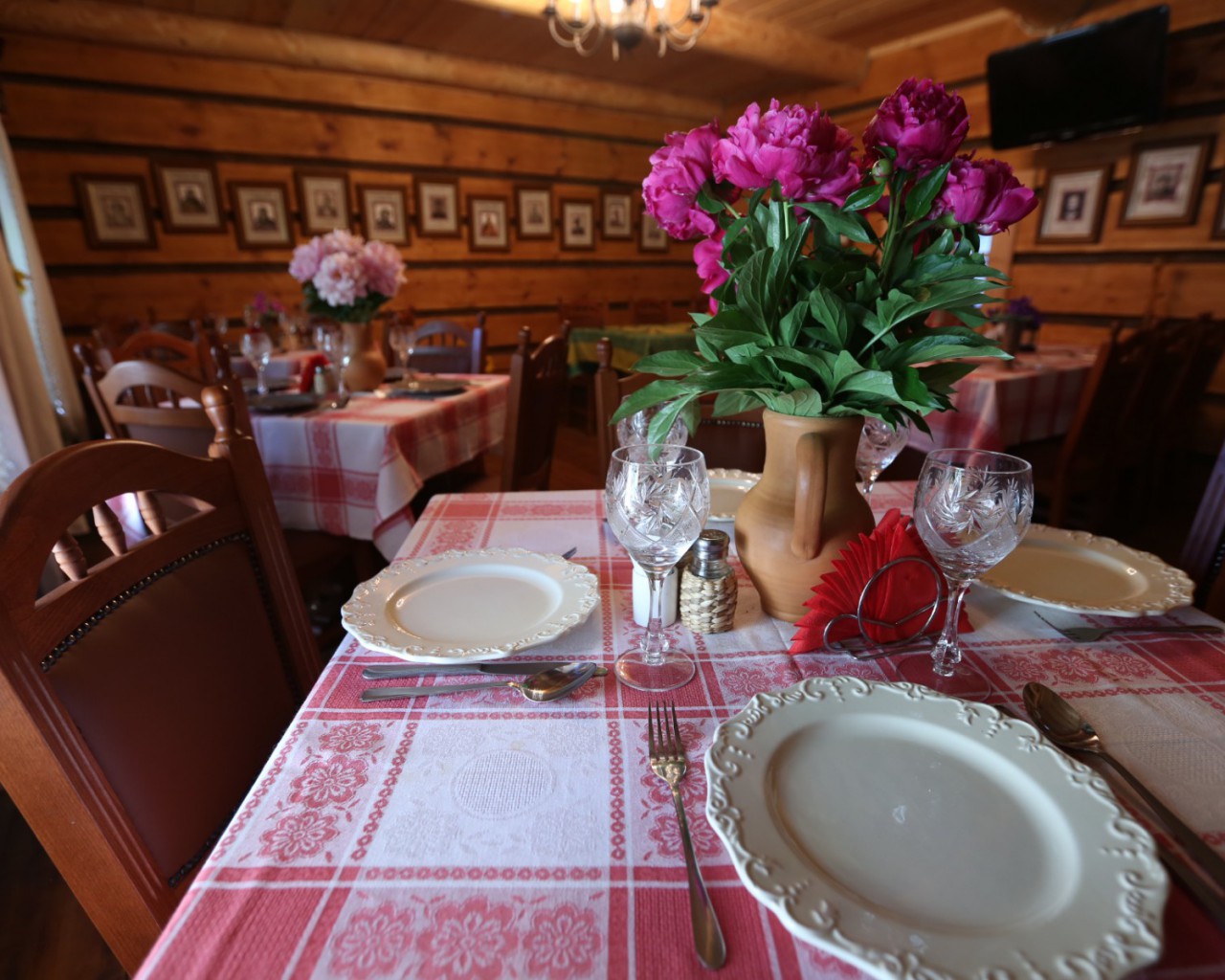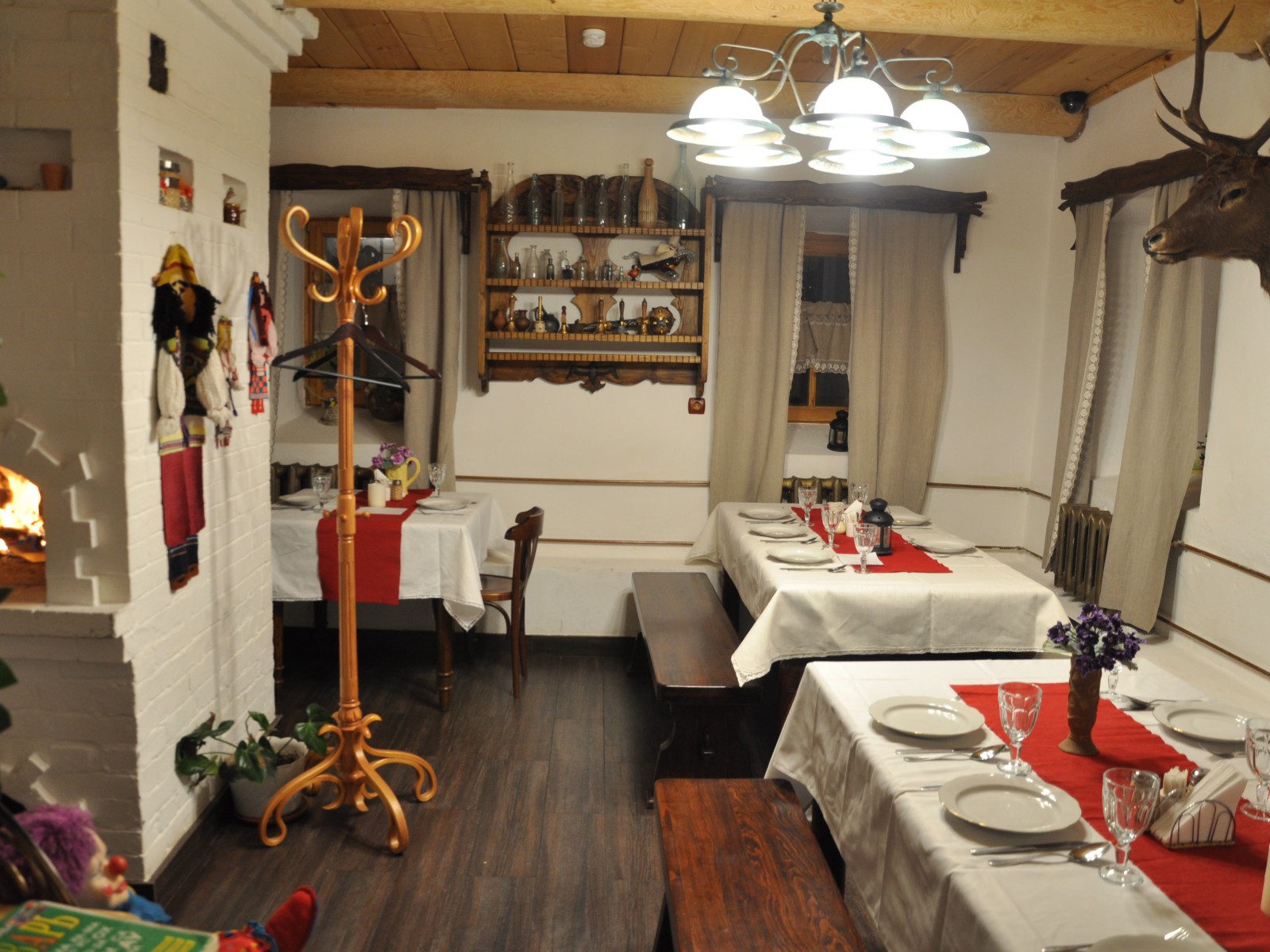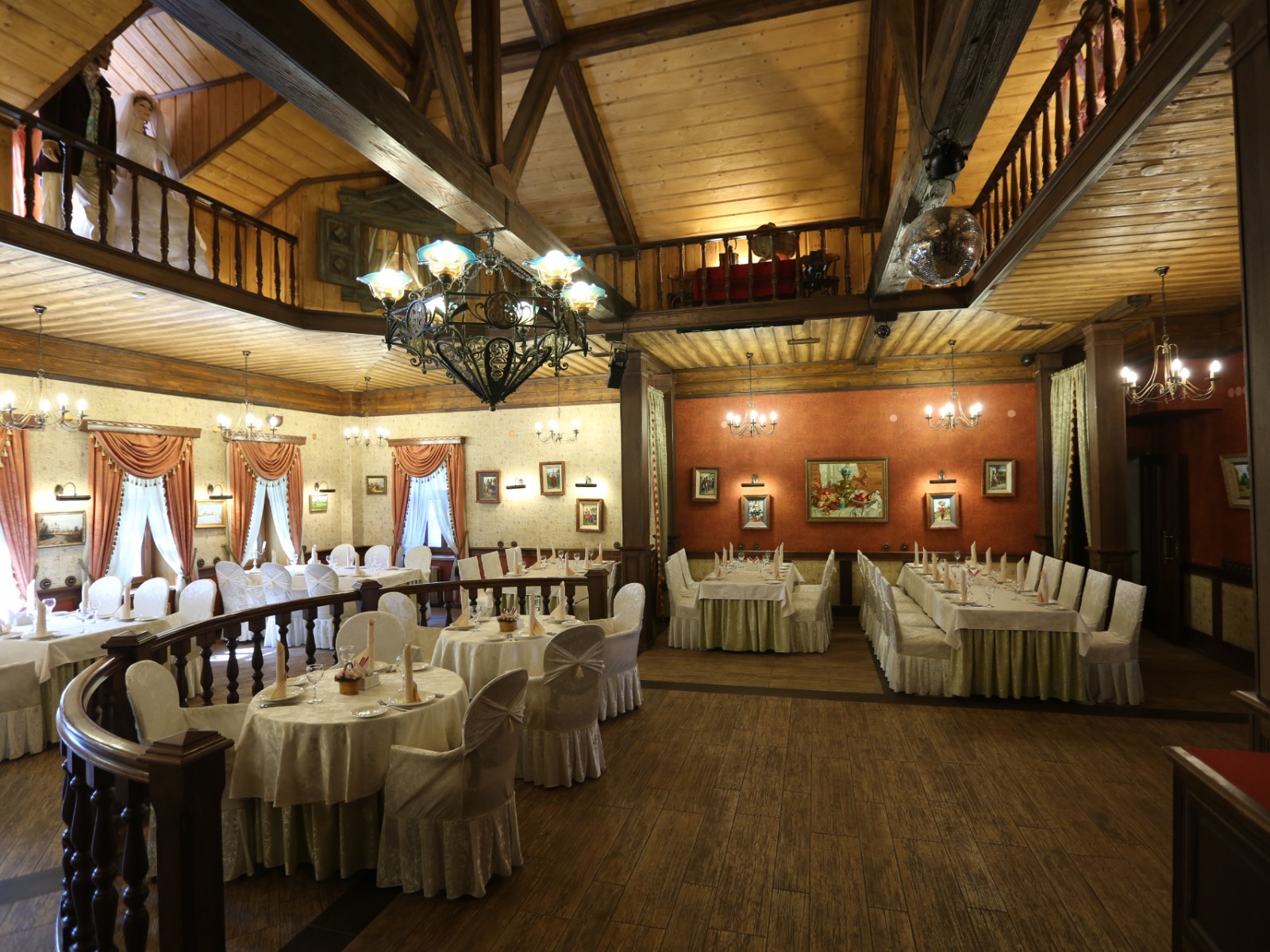 Красный зал ресторана вместимостью до 50 человек приглашает гостей на трапезу в уютной обстановке.
