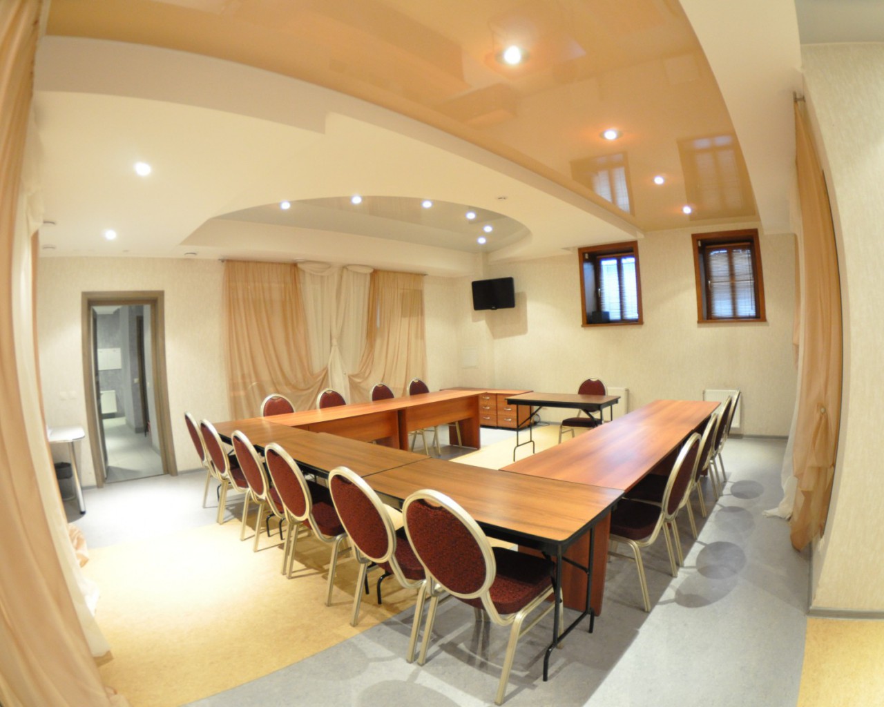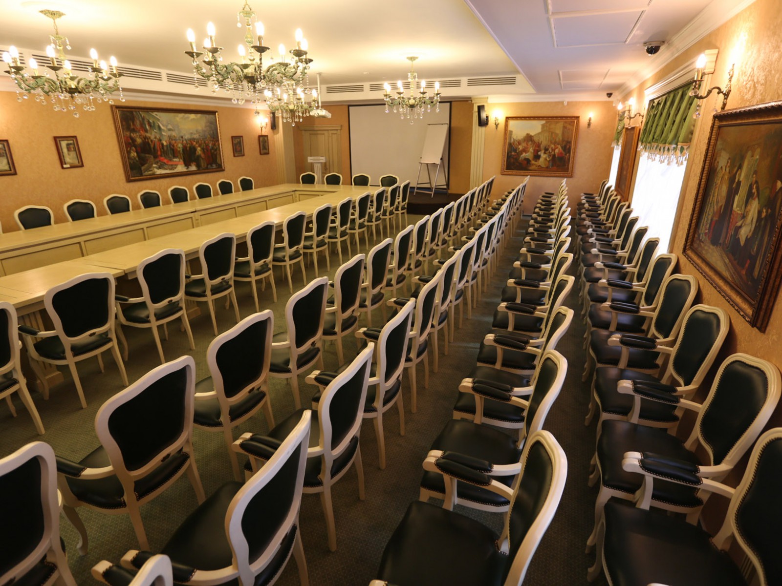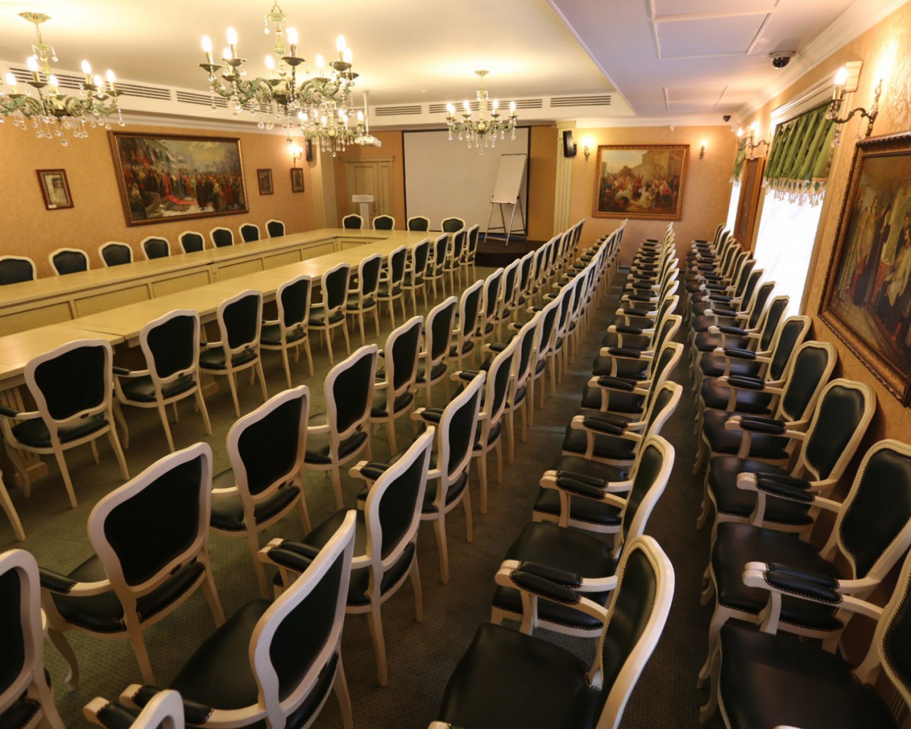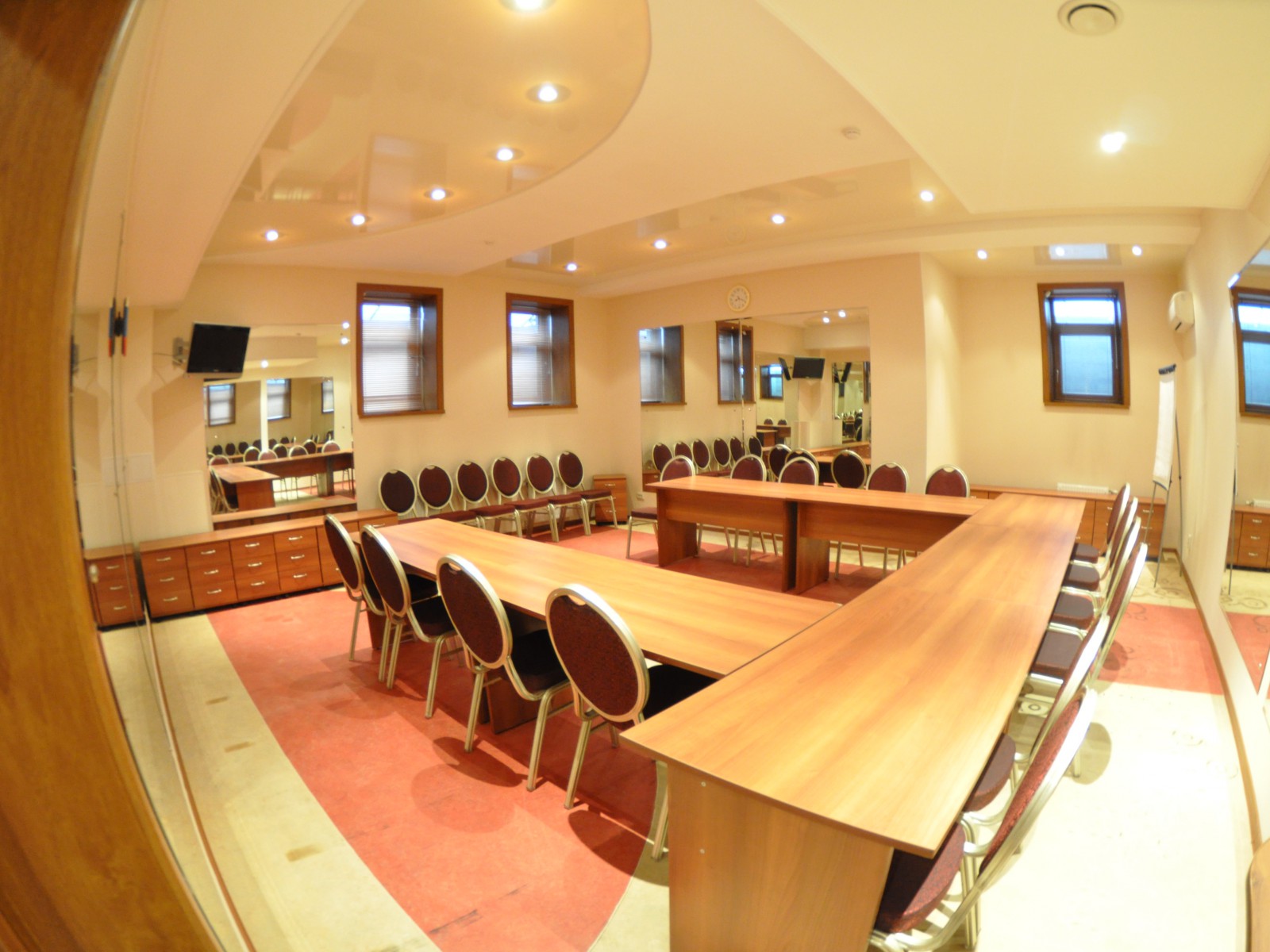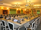 Конференц-зал: прекрасное место для проведения тренингов, семинаров и банкетов. Изысканная мебель и современное оборудование созданы для организации мероприятий международного уровня. Оборудован кабинами для синхронного перевода.