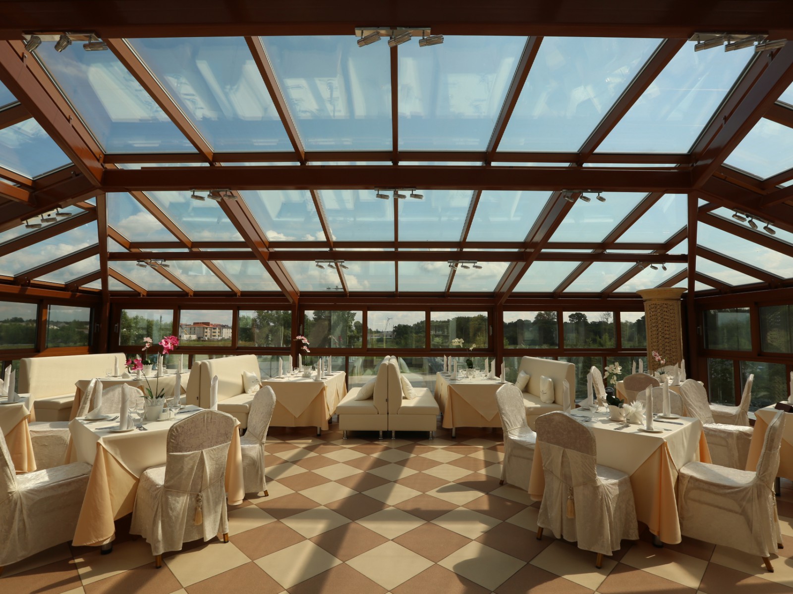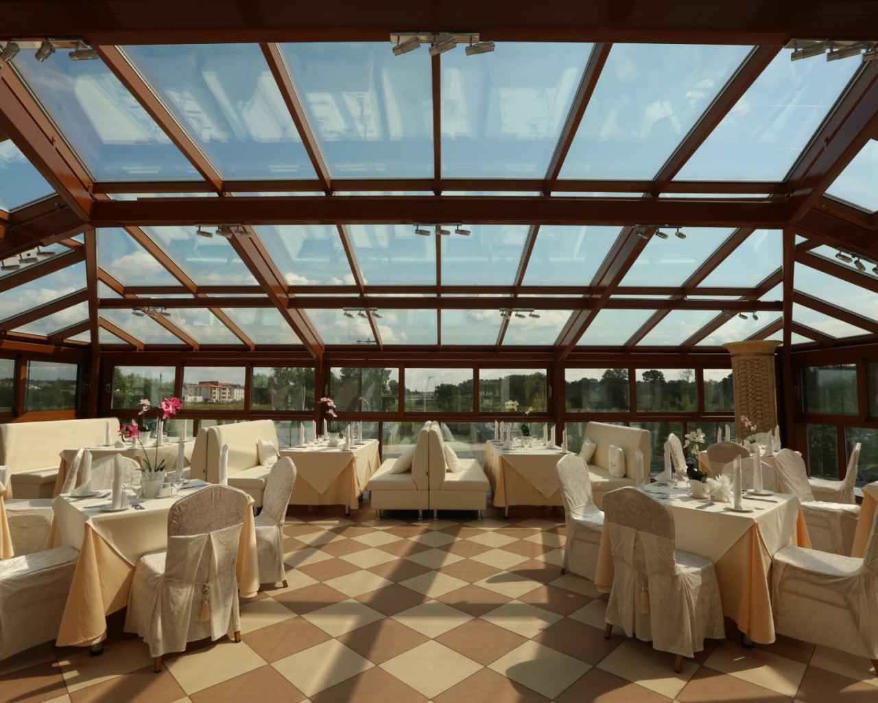 Веранда с панорамной крышей: посетители ресторана могут выбрать для себя светлый зал с панорамной крышей вместимостью до 50 человек. Здесь можно не только полюбоваться звёздами на тёмном небе, но и взглянуть на широко раскинувшиеся Суздальские просторы, называемые Опольем.