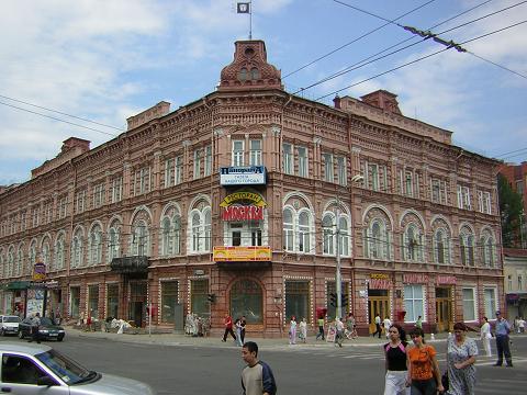 Архитектурные особенности: Построено здание в «ропетовском» стиле открытого кирпича. Фасад украшен затейливым орнаментом из кирпича, декоративными карнизами, веселыми кокошниками - что-то от расписной новгородской избы, от старинных боярских палат, от знаменитой кремлевской зубчатки. Картину дополняет башенка с флюгером, балконы с хитросплетенным литьем перильцев и оград, сработанных на чугунно-литейном заводе саратовской купчихи А.В.Чирихиной.