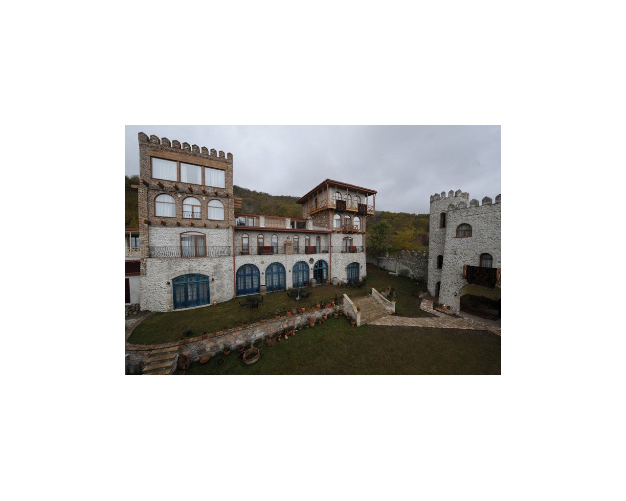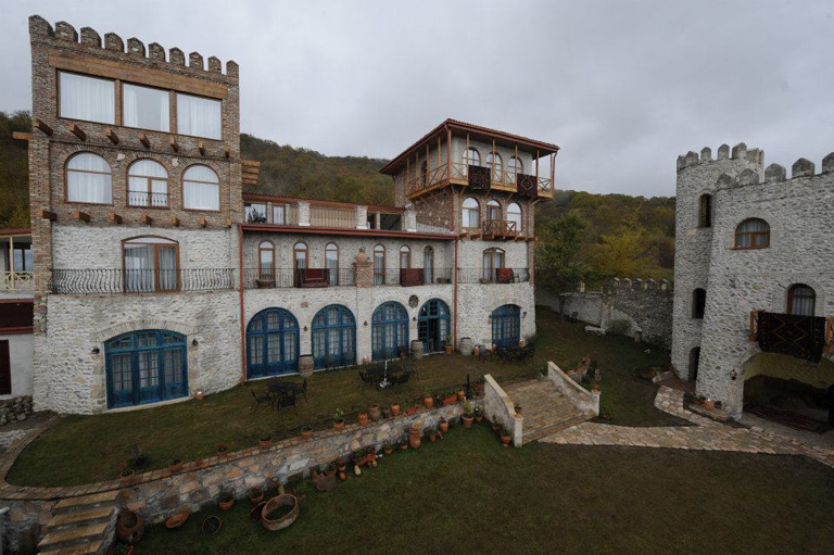 Территория за оградой напоминает двор средневекового замка – каменная ограда, мощенный двор, четыре башни, кресла из сена, цветы вокруг... а вдали большой Кавказ и Алазанская долина – идеальная возможность отвлечься от суеты и однообразия.