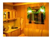 Сауна: мини-бассейн, гидромассаж, бочка "Камбала" с холодной водой, по желанию клиентов с травяными настоями, комната отдыха, оборудованная холодильником, телевизором (принимаются каналы Космос ТВ), чайником и набором посуды. Клиентам предоставляются халаты, тапочки, полотенца, шампунь, гель, бальзам.