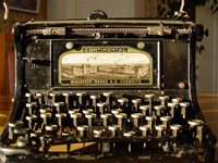 Пишущая машинка из Правления АИК «Кузбасс», располагавшегося в Главной конторе Кемеровского рудника. Приказы в колонии выходили на русском и английском языках, и поэтому использовались машинки с русским и латинским шрифтами. Это одна из машинок с русским шрифтом. После реорганизации АИК машинка попала в трест «Кузбассуголь», затем перешла в частные руки, с 1950-х гг. находилась в Кузбасском политехническом институте.