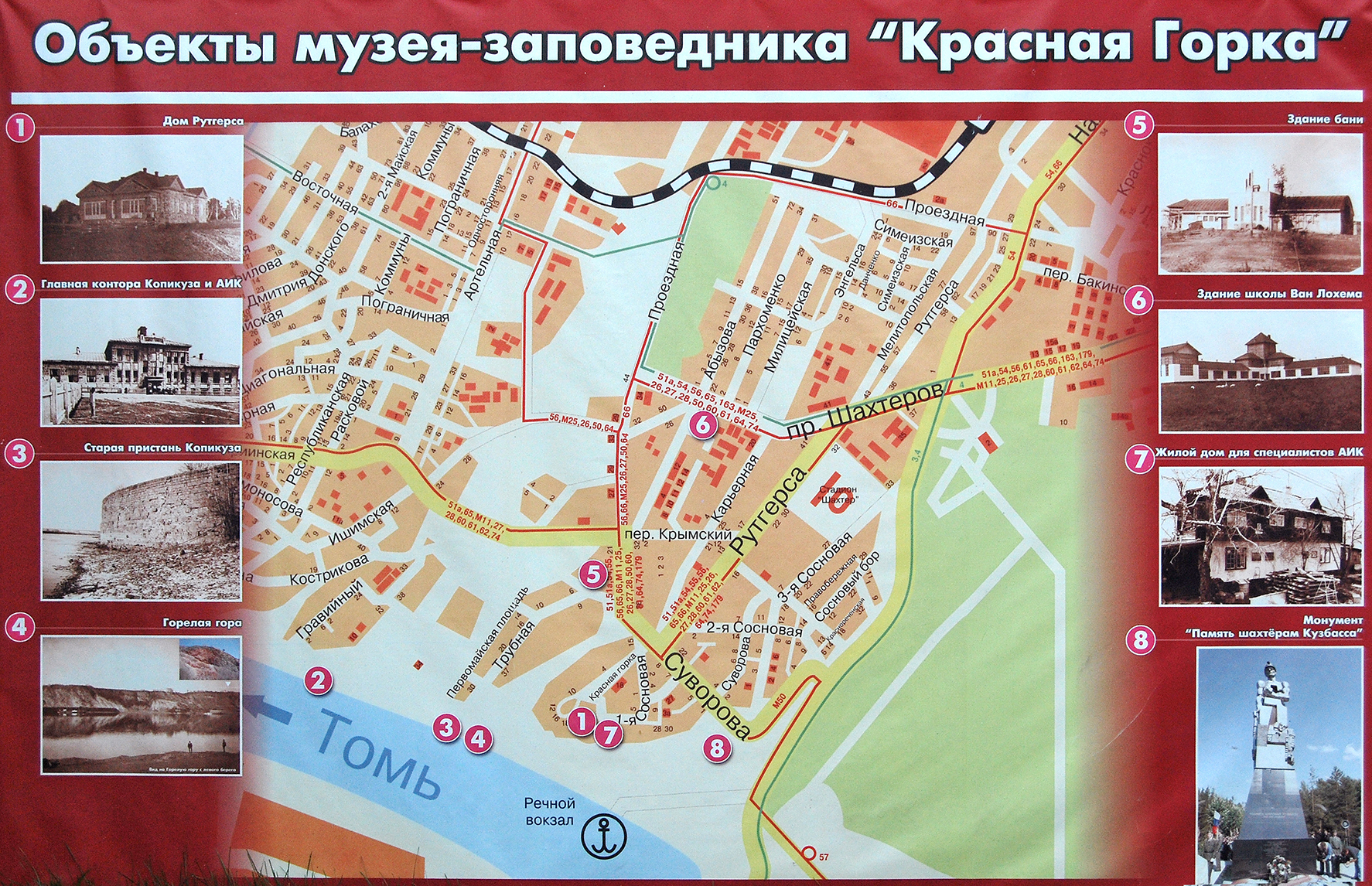 _Штольня._ Рядом с Красной горкой на берег выходит устье одной из первых штолен Кемеровского рудника. Рудник был заложен Алтайским горным округом в 1907 г. Для проведения разведочных работ были заложены шахты и несколько береговых штолен: Кемеровская, Викторовская, Владимировская.