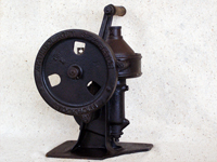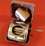 _Прибор для заточки бритвенных лезвий_ Изготовлен торговой фирмой «Twinplex Sales Company. St.Louis. MO» по продаже безопасных бритв, которая получила иностранный патент до мая 1919 г. Прибор состоит из металлического никелированного корпуса с выдвигающейся осью, на которую насаживается лезвие. С другой стороны корпуса выдвигается рукоятка, вращающая ось с лезвием. Внутрь корпуса закладывается специальная паста, служащая абразивным материалом. В результате механического вращения и трения о пасту, лезвие затачивается. Отверстие в корпусе закрывается специальной крышкой. Прибор упакован в металлический никелированный футляр с шелковой подкладкой.