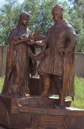 2. Памятник открыт 02.09.2011 года. Петр и Феврония Муромские, супруги, святые, стали символом долгой и верной любви, крепкой семьи. В основе их истории - любовь, волшебная и исцеляющая. Праздник семьи, любви и верности отмечался в Российской империи влоть до 1917 года. Сейчас он вновь возвращен в календарь - 8 июля. Скульптор - Исаков С.М.