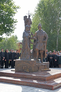 4.Миниатюрный макет памятника представил известный скульптор, заслуженный художник России Сергей Исаков, который является автором памятников Святителю Макарию Невскому и Петру I в Бийске. Скульптор изобразил князя Петра и его супругу, крестьянскую девушку Февронию, над которыми возвышается Ангел.