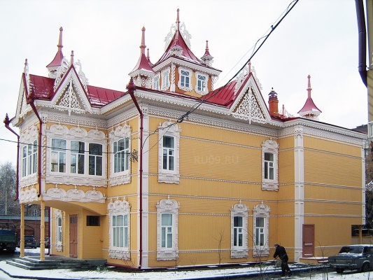 Всё здание - как бы постамент для центральной башни, увенчанной плавно изогнутым высоким шатром красивого рисунка. Очень интересны прорезные решётки во фронтонах со сложным узором растительного орнамента. Стилизованные жар-птицы и резные волюты угловых башенок. Изогнутые линии их шатров придают рисунку кровли особую свежесть и остроту.