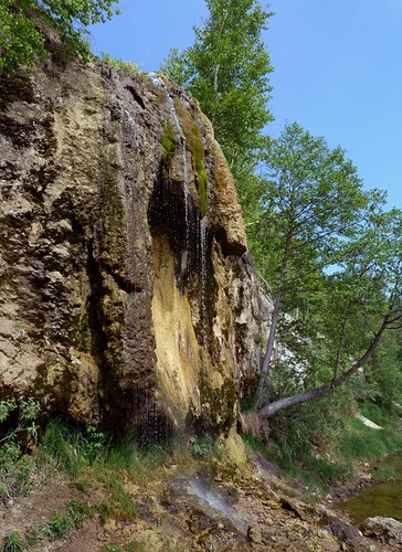 Другое его название - Зеркальный водопад. Или потому что летом водопад почти пересыхает, и струится по скалистой, обильно поросшей мхом стене, образуя иллюзию зеркальной поверхности, или потому что вид его напоминает старинное зеркало в массивной вычурной раме.