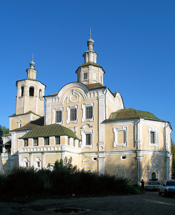 Собор Спаса Преображения (1755 г.) - наиболее яркий среди сохранившихся смоленских памятников барокко, с заметным влиянием украинского зодчества. Центр композиции - сильно вытянуты вверх двухэтажный четверик с большими полукруглыми фронтонами на северных и южных фасадах, увенчанный 8-гранным световым барабаном с главкой. Апонда 5-гранная, к трапезной примыкает колокольня на одной оси с храмом. Композицию дополнили (видимо, в XIX в.) открытые, раскинувшиеся полукругом западные крыльца (до 1930-х гг. это была открытая галерея). В 1972-74 гг. собор реставрирован.