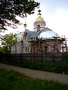 К сравнительно небольшому четверику с полукруглой, вытянутой, чуть суженной апсидой под высокой купольной кровлей примыкает более широкая трапезная, составляющая с основанием колокольни и притворами по его сторонам единый прямоугольный объем. Барабан главы и восьмериковый ярус колокольни, поднятый на двухступенчатом основании, перекрыты куполами. Они почти одинаковы по высоте и незначительно превышают основной одноэтажный объем здания с высокими полукружиями-порталами над северным, южным и западным (здесь он несколько понижен) входами. Сильно выступающие перспективные архивольты порталов имеют килевидное подвышение. Основной мотив убранства фасадов - сдвоенные и одинарные арочные окна (частью ложные; некоторые превращены в прямоугольные), заключенные в наличники с килевидным верхом. На стенах трапезной они разделены рустованными пилястрами, а на четверике фланкированы полуколоннами порталов. Круглые окна барочного типа с четырьмя квадратными накладками по окружности размещены в центре портальных тимпанов боковых фасадов.