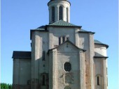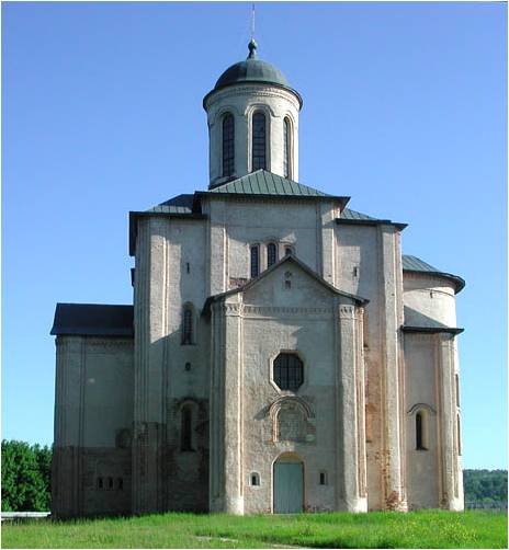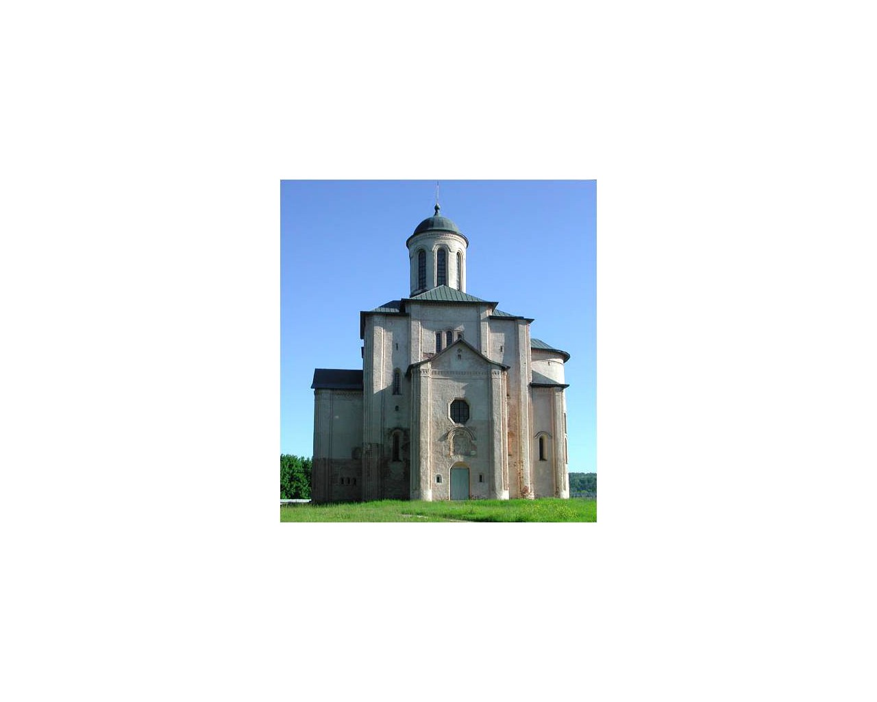 4. Возведена в последней четверти XII века, в княжение великого князя Давида Ростиславовича. Дворец и другие княжеские палаты были сооружены из дерева, а поэтому до нашего времени не сохранились. Это были, судя по отрывочным историческим данным, затейливой резьбы хоромы, обнесенные по склоны Смядынского холма дубовым тыном. Стройная и изящная по своим архитектурным формам, Свирская церковь, точно белокаменный маяк, окруженный пристроями, устремлялась вверх.
