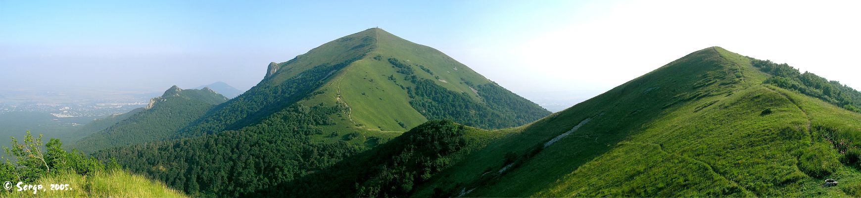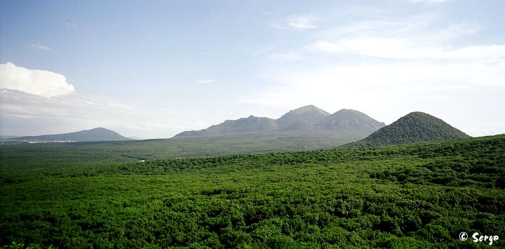 2. Общие сведения: Памятник природы Ставропольского края. Государственный природный заказник "Бештаугорский" 17 августа 2001 г. Гора Бештау — самая высокая вершина Кавминвод. Отсюда открывается круговая панорама всего курортного района. Гора Бештау (пять гор) дала название и окружающей местности (Пятигорье) и городу Пятигорск, расположенному поблизости. Впечатления от подъема на Бештау нельзя передать словами. Стоя на вершине, кажется что весь мир у твоих ног (тем более что окружающая местность достаточно ровная и видно далеко). В ясную погоду можно увидеть величественные вершины Эльбруса. Иногда через вершину Бештау или под ней начинают проплывать облака. Расположена в центральной части группы палеовулканов, в окружении городов Пятигорска, Лермонтова, Железноводска и поселка Иноземцево. О возникновении горного массива Бештау известный краевед В.Г. Гниловской рассказывает: "У самой большой горы Бештау, как и у некоторых других пятигорских гор, магма ... пробила толщу земной коры и вышла на ее поверхность. Таким образом, Бештау и некоторые другие лакколиты нашего края оказались не лакколитами, как об этом думали раньше, а настоящими вулканами". Вулканическая магма застыла на склонах горы причудливыми скалами, которые имеют собственные имена: Трахит, Орлиные скалы, Кукла, Бастион и другие. Природные ресурсы Кавказских минеральных вод прекрасно сочетаются с местным климатом. В целом климат здесь тёплый, умеренно континентальный. Южное положение обеспечивает поступление большого количества солнечного тепла в течение всего года. Характер местности и близость снежных вершин Главного Кавказского хребта с одной стороны, а с другой - соседство засушливых степей и полупустынь Прикаспийской низменности определяют изменчивость степени континентальности по мере увеличения высоты над уровнем моря, от умеренно-континентального в северо-восточной степи до переходного в юго-западных хребтах Большого Кавказа.