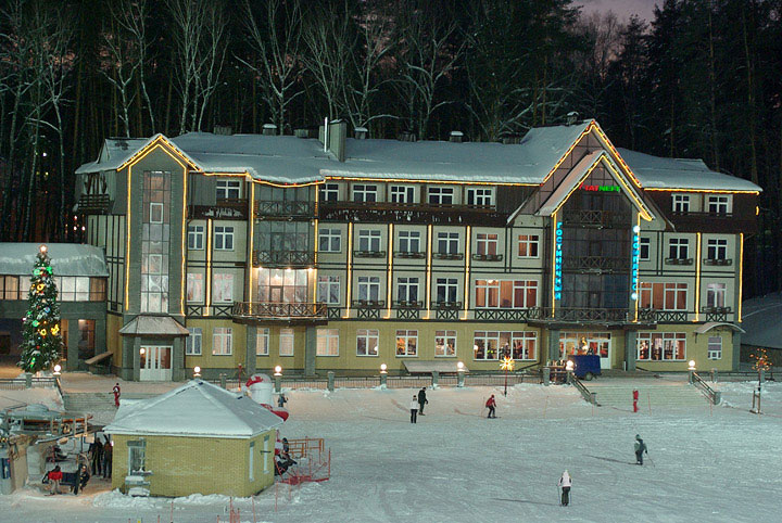 8. С гостиницей "Ян" объединено теплым переходом здание, совмещающее в себе спорт-кафе на 72 человека, шашлычную на 36 мест, ресторан, рассчитанный на 53 места. Из окон здания открывается отличный вид на горнолыжные трассы.