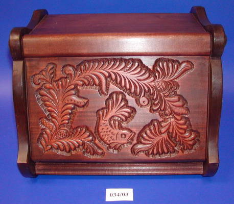 Традиционно - украшенные резьбой постройки, мебель, посуда: чаши, ковши, солонки, подносы, ложки, жбаны и т.д., орудия труда: прялки, ткацкие станы, вальки, также детские игрушки и др., сувениры из капо-корня: трубки, шкатулки, панно, посуда.