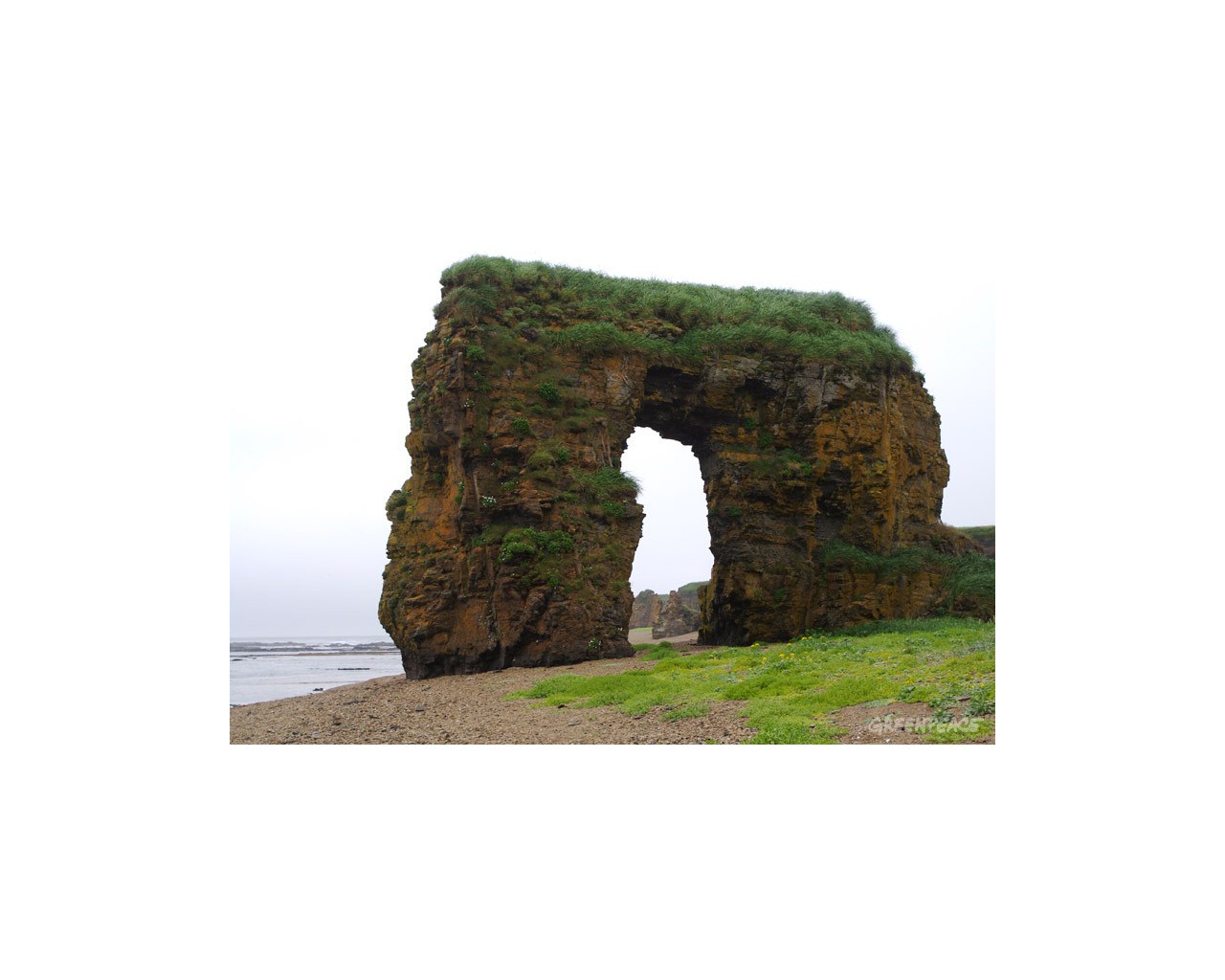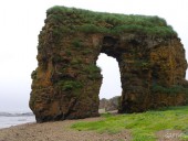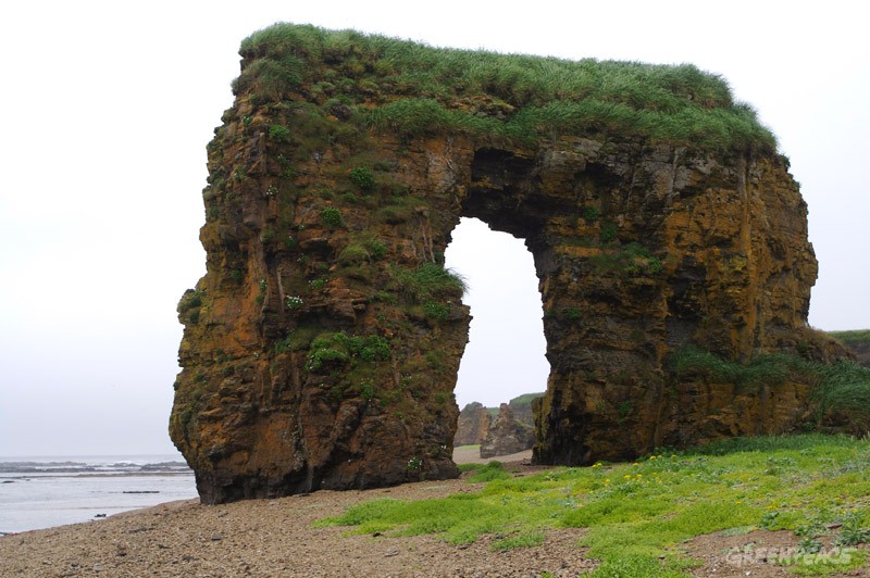 Одной из известных достопримечательностей острова стала Арка Стеллера. Это очень живописное место. За многие века вода и ветер образовали в горных породах большой каменный свод. С одной стороны от Арки шумит птичий базар, а с другой открывается вид на величественный водопад.