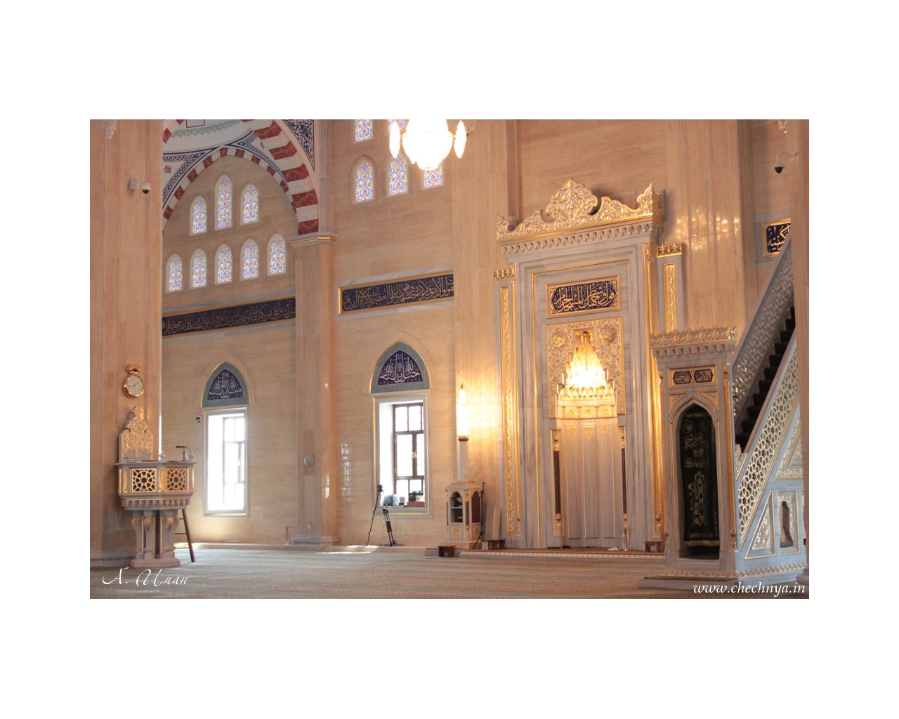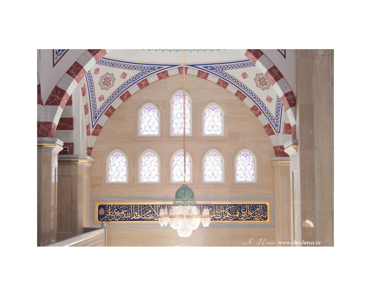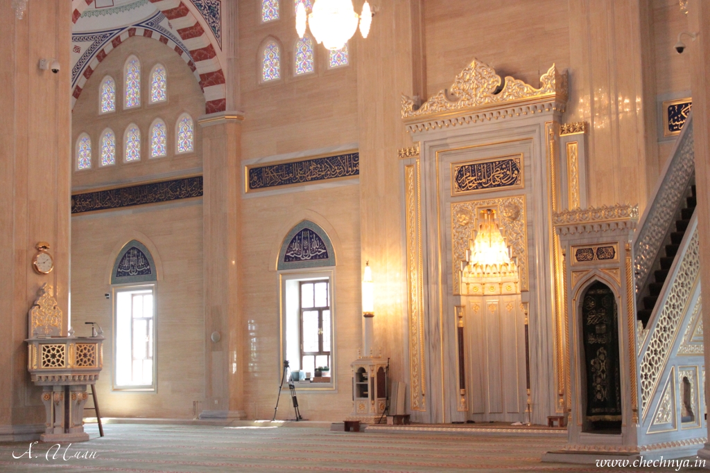 Молитвенная ниша в стене мечети – михраб (8 метров в высоту и 4,6 метра в ширину), изготовленная из белого мрамора, обращена в сторону Мекки, указывая верующим направление во время молитвы. Сама ниша создаёт иллюзию бесконечного углубления пересекающихся пространств. Внутри мечети использовано искусство каллиграфии. Аяты из Корана искусно вплетены в общий орнамент архитектурного убранства мечети. Свод главного купола мечети венчает сура 112 «Ихлас» (очищение), которая переводится как «Он – Аллах, единый, Аллах вечный. Он не родил и не был рождён, и нет никого, равного Ему».