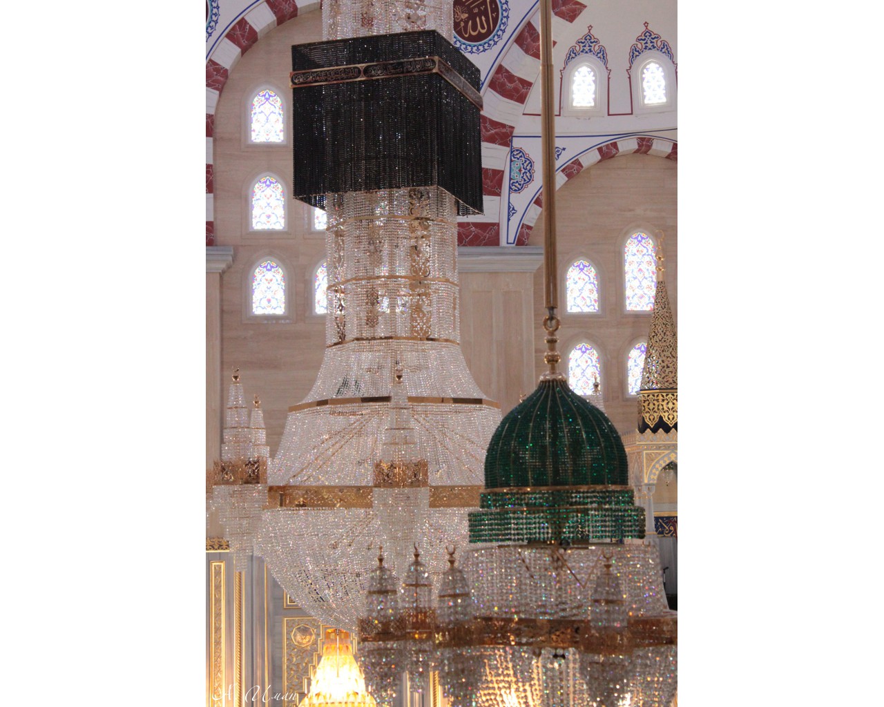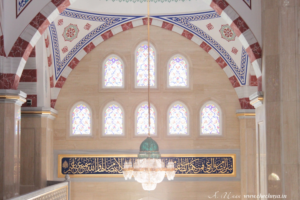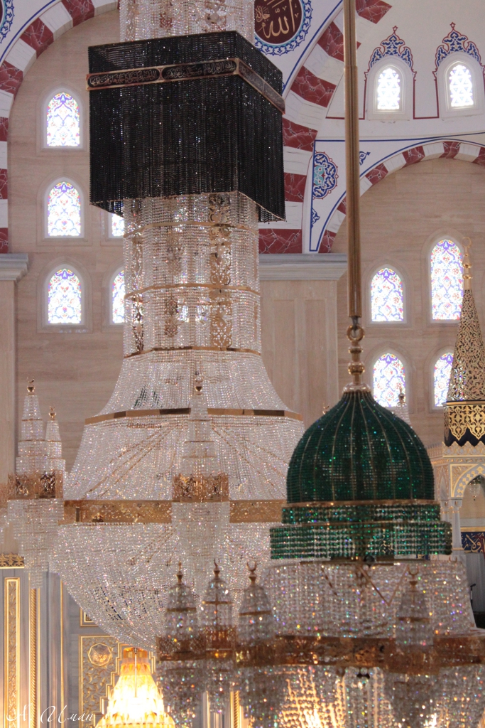 В мечети установлено 36 люстр. Своими формами они напоминают три святыни ислама – 27 из них имитируют мечеть Куббату-ас Сахра в Иерусалиме, 8 сделаны по образцу мечети Ровзату-Небеви в Медине и самая большая, 8-метровая люстра повторяет по формам святыню Кааба в Мекке. На создание коллекции ушло несколько тонн бронзы, 2,5 кг золота высшей пробы и более 1 миллиона деталей. Люстры имеют чеченский орнамент, который специально подбирался дизайнерами. Люстры изготовлены из кристаллов Swarovski турецкой фирмой «USTUN AVIZE».