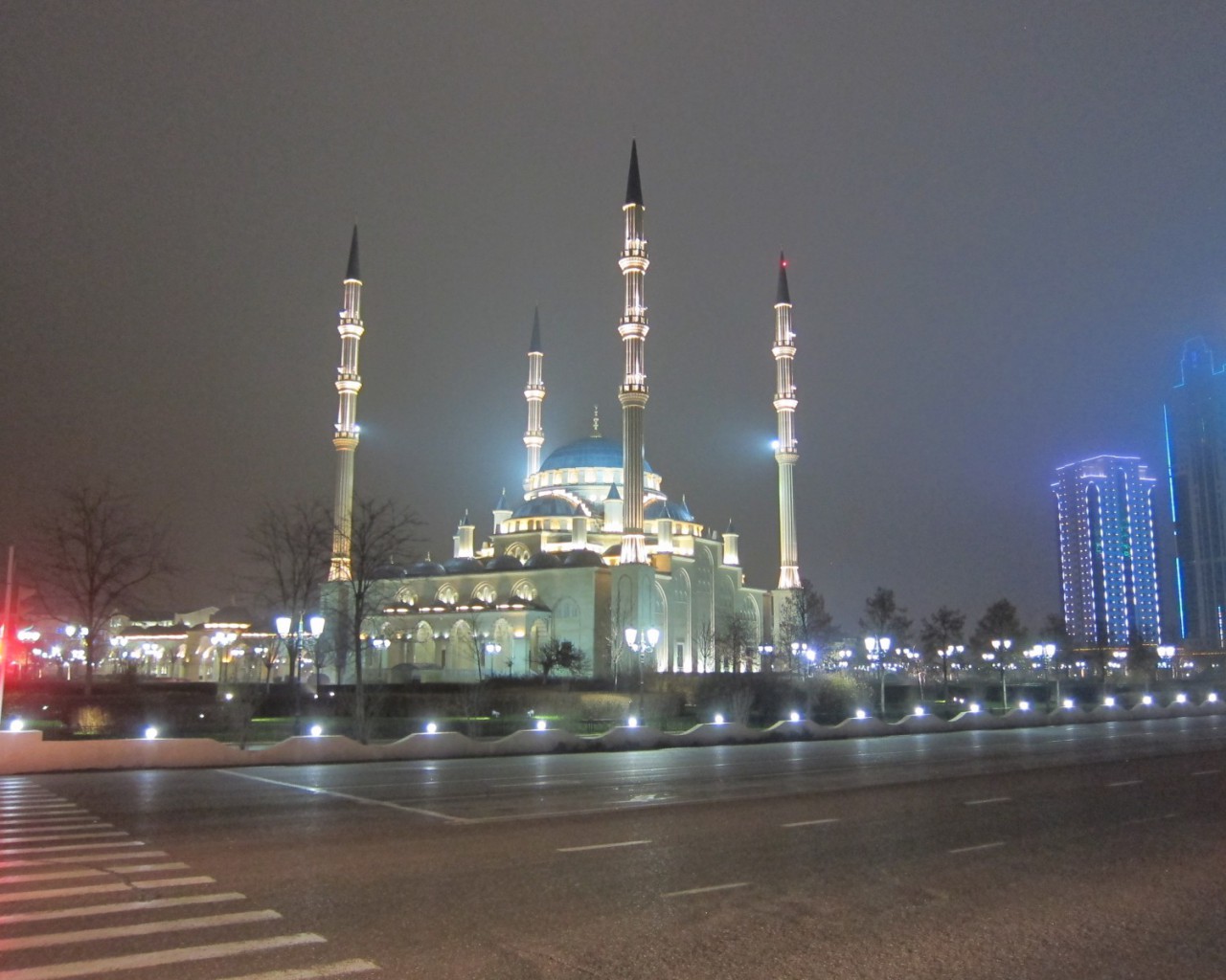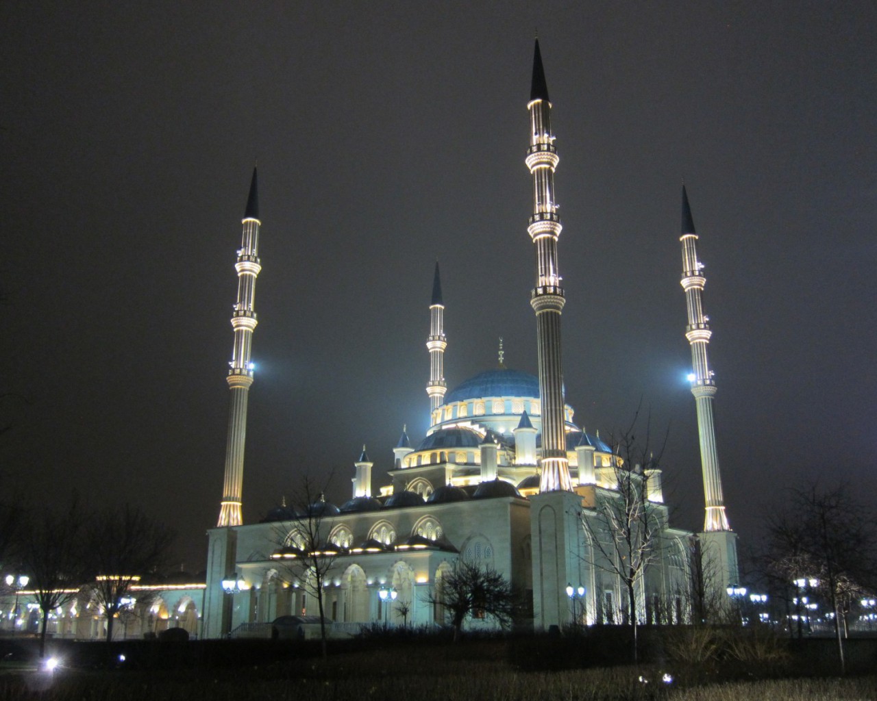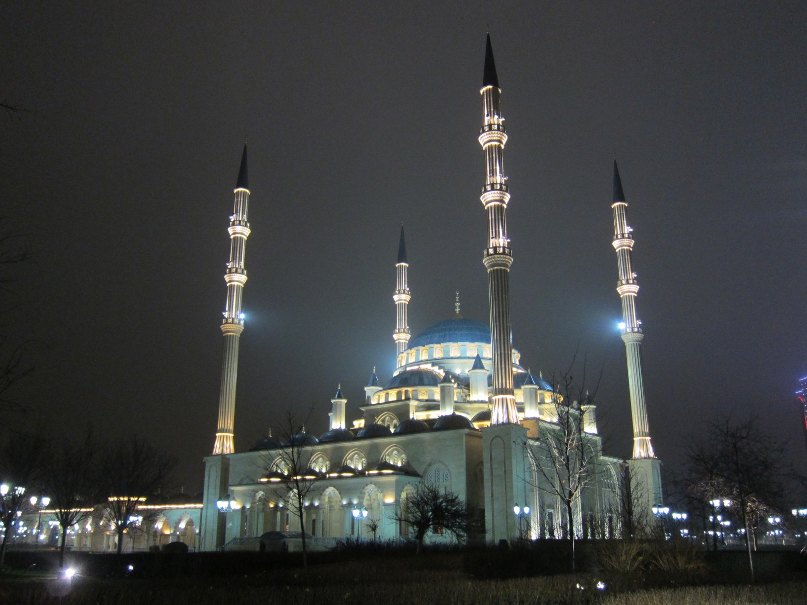 Концепция освещения грозненской мечети была выполнена из трех уровней. Первый уровень – заливающее освещение, обеспечивающее ровное освещение нижней части сооружения и минаретов. Второй уровень – акцентное освещение архитектурных элементов здания. Третий уровень – праздничное освещение. Такое световое решение позволяет зрительно поднять высоту минаретов и сделать динамичным освещение на центральном куполе.