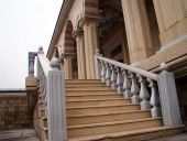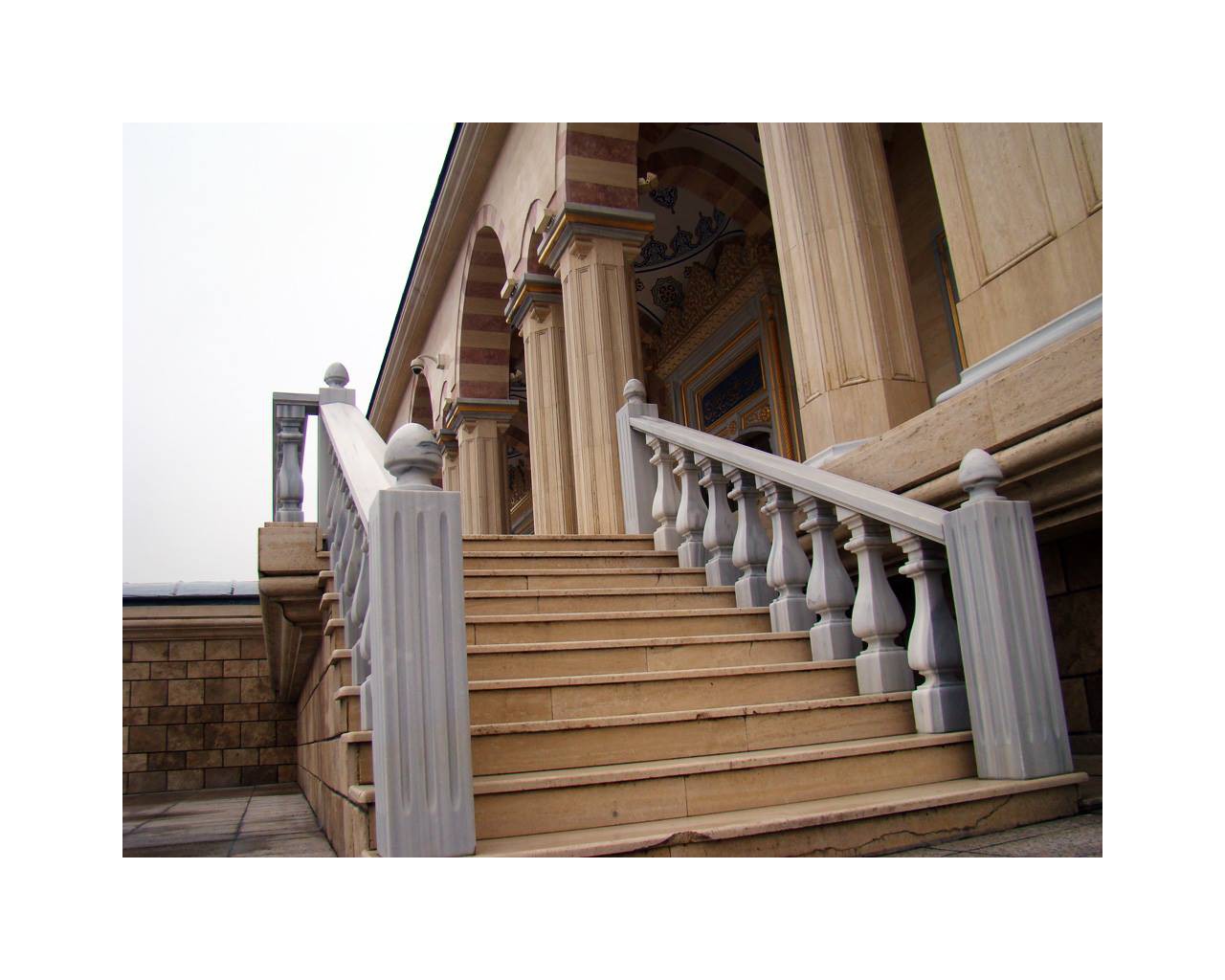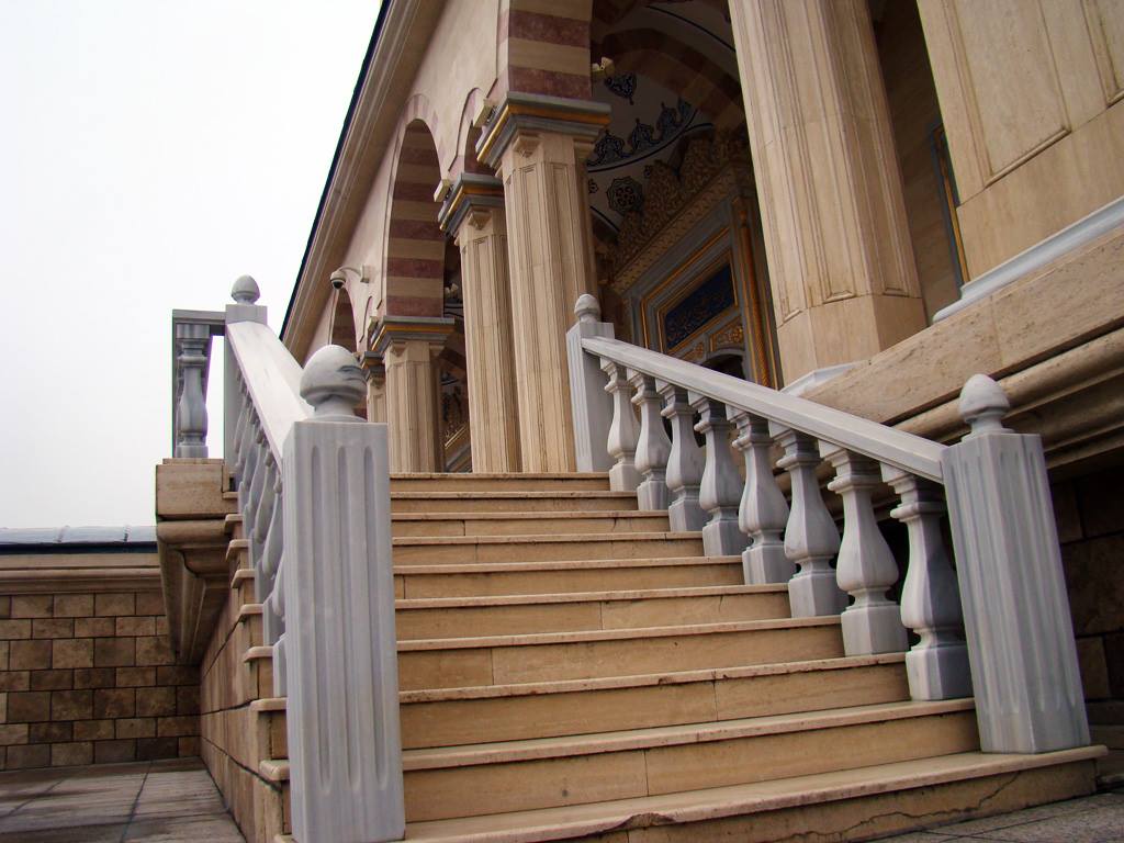 Наружные и внутренние стены мечети отделаны редчайшим мрамором – травертином, а интерьер храма обильно декорирован белым мрамором, который добывают на острове Мармара Адасы в Мраморном море (Турецкая провинция Балыкесир).