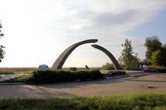 4. Описание объекта: мемориал был возведён 29 октября в 1966 г. Арка, обрамляющая ладожский го¬ризонт, по мере приближения разделяется на две железобетонных дуги, а просвет между ними как раз и служит символом Дороги жизни. В этом месте близ деревни Ваганово грузовики, преодолевшие ладож¬ский лед, въезжали на твердую землю. В бетонном основании мемориала — следы шин, уходящие в сторону заросшего берега озера, рядом — зенитка. «Кольцо» поставили в 1966 году на деньги трудящихся Калининского района.В этом месте фашистская блокада была разорвана мужеством и стойкостью защитников города. Мемориальную композицию дополняют белые железобетонные шары, имитирующие прожекторные установки. Рядом установлена настоящее 85-мм зенитное орудие калибра 45 мм.. Оно служит напоминанием о том, что в годы войны у спуска располагалась зенитная батарея. Авторы мемориала: автор идеи памятника скульптор К. М. Симун, архитектор В. Г. Филиппов, инженер-конструктор И. А. Рыбин.