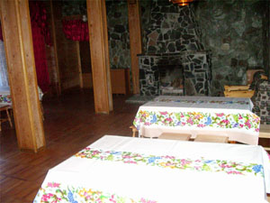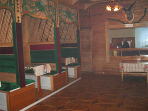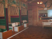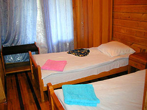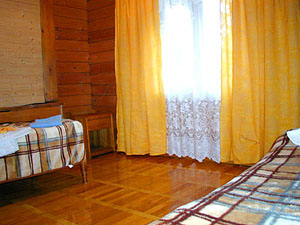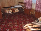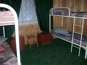- Люксы четырехместные трехкомнатные № 27а, 28, 38: ванна или душ, умывальник, туалет; две спальни, гостиная с камином, телевизор, холодильник, мягкая мебель.