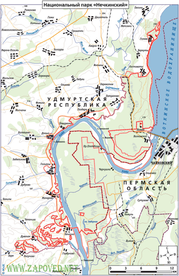 ООПТ регионального значения. Полное название: Нечкинский национальный парк. Административное здание национального парка расположено по адресу: Удмуртская Республика, Воткинский р-н, п. Новый, ул. Костоватовская, д. 1. Тел/факс 8(34-145) 7-21-13