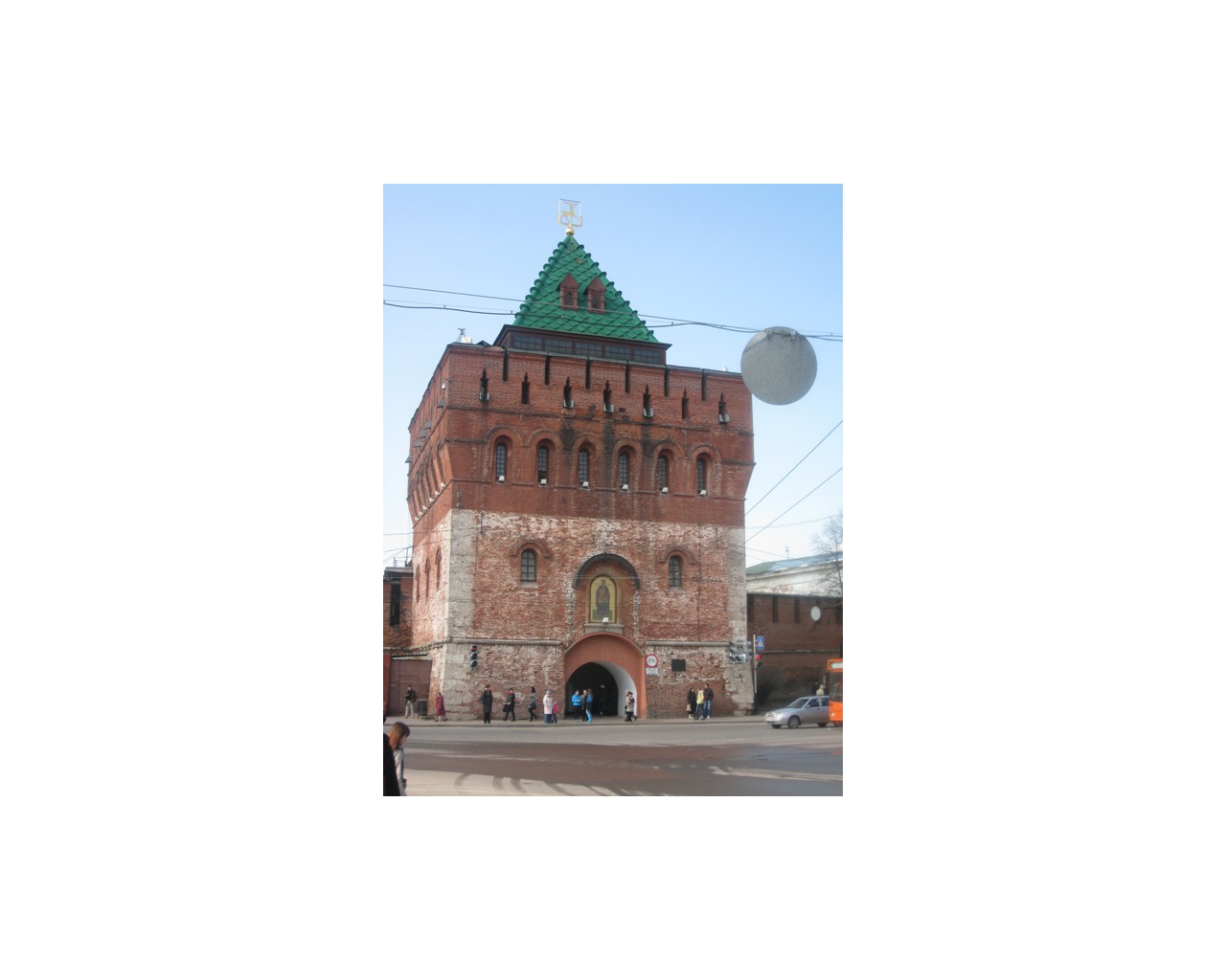 Большинство кремлевских башен, и не только в Нижнем Новгороде, называются либо по именам святых, либо по ближнему урочищу, либо по назначению, иногда - по легенде. Дмитриевская башня Нижегородского Кремля, похоже, единственная в своем роде кремлевская башня, которая носит имя ее основателя, великого князя Дмитрия Константиновича, с именем которого связана попытка создания Нижегородского белокаменного Кремля XIV столетия. • В старинных источниках есть указания на существование в Нижегородском Кремле различных тайников, подземных ходов и т.д. Подземное хозяйство крепости, к сожалению, пока не изучено. Общее количество бойниц и боевых окон в Нижегородском Кремле - 1290, что позволяло создать плотный фланговый огонь и не заботиться о машикулях.