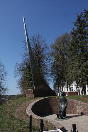 4. Описание объекта: Монумент «Основателю Космонавтики». Представляет собой во много раз уменьшенную копию московского монумента Космонавтике - взлетающая ракета и фигуру Циолковского, мечтателя, устремленного в небо. Скульптурная композиция московского скульптора С. Бычкова установлена в честь 150-летия К. Э. Циолковского в 2007 году. Изготовлена из бронзы, вес 600 кг. Ранее, в середине 1960-х годов, на этом месте был установлен памятник Циолковскому в виде бюста, но в 1980-х годах психически неуравновешеный гражданин дважды снёс бюсту голову.