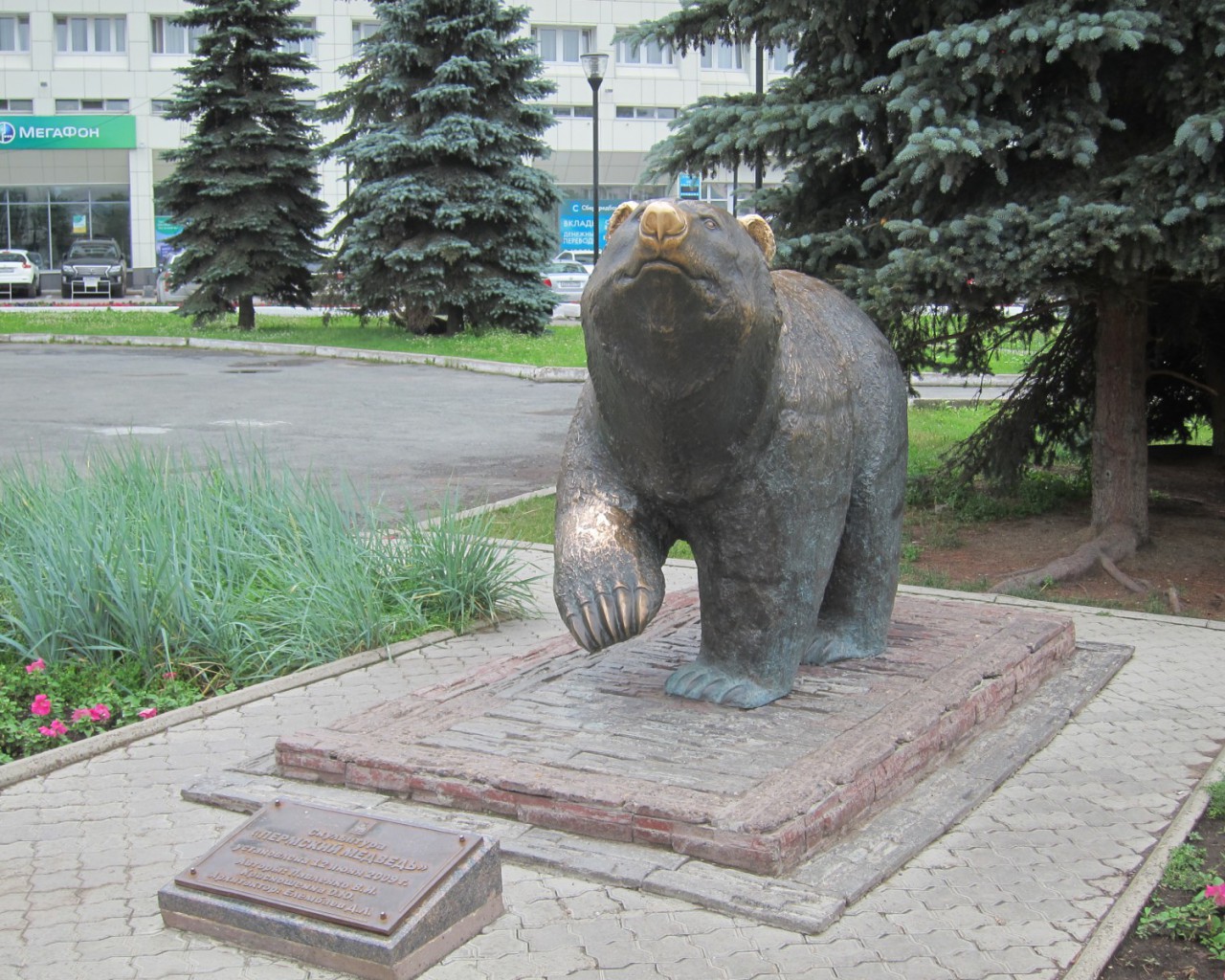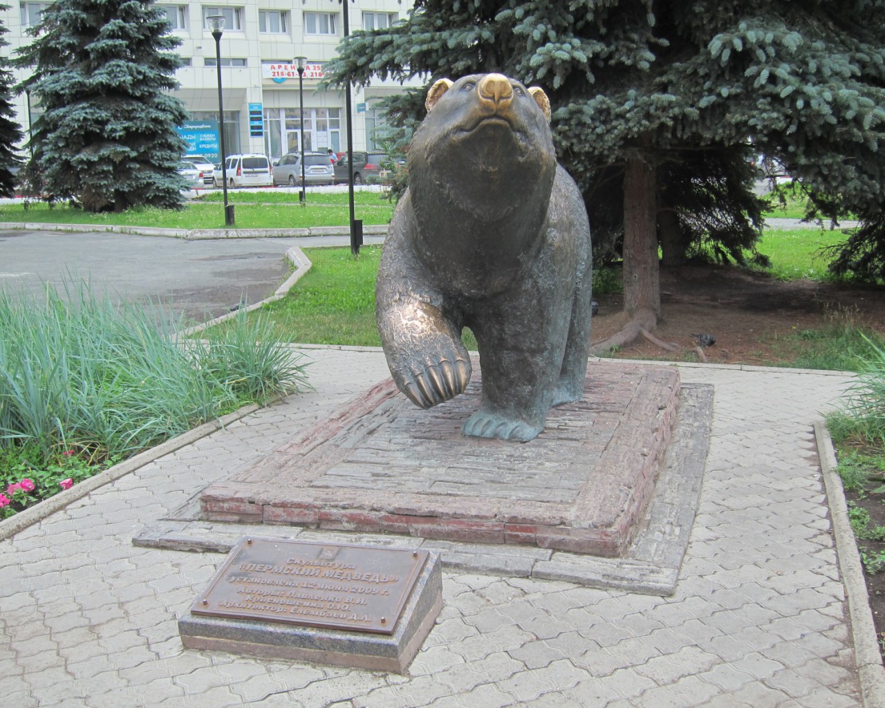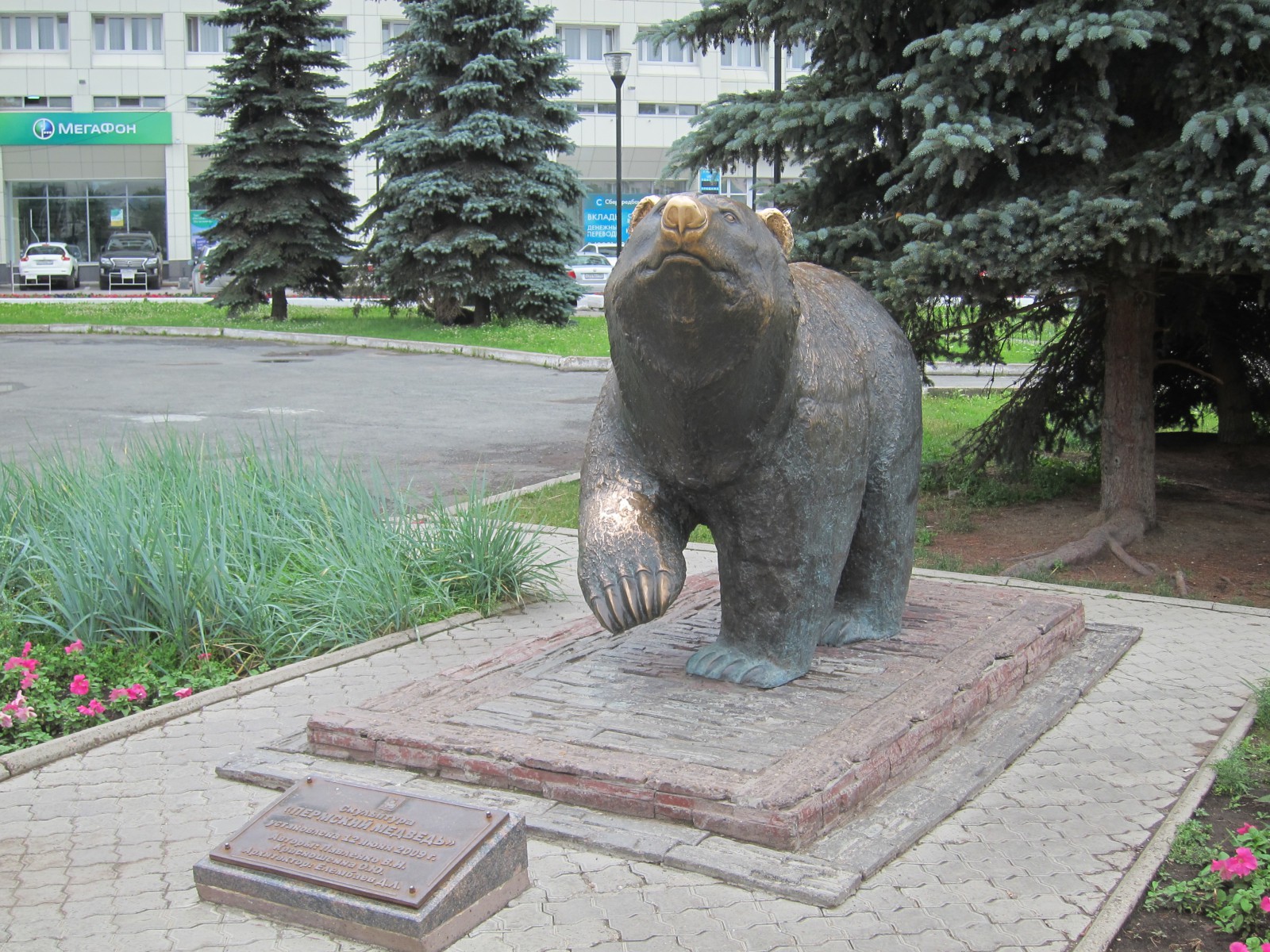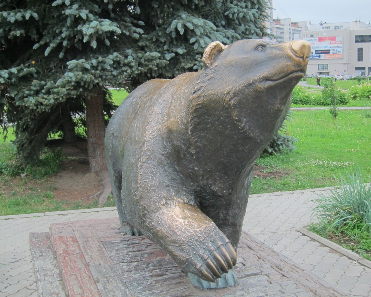 Монумент изготовлен из искусственного камня и занимает площадь около 3,5 м2. Масса медведя — 2,5 т, основания памятника — 1 т.