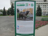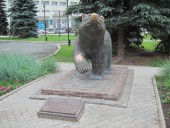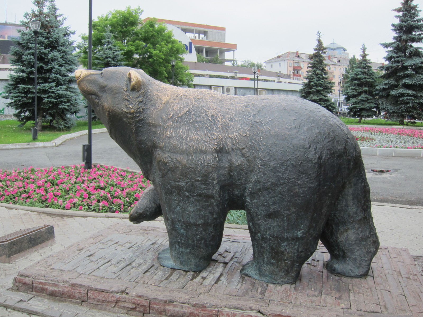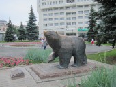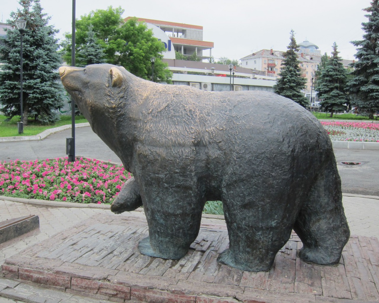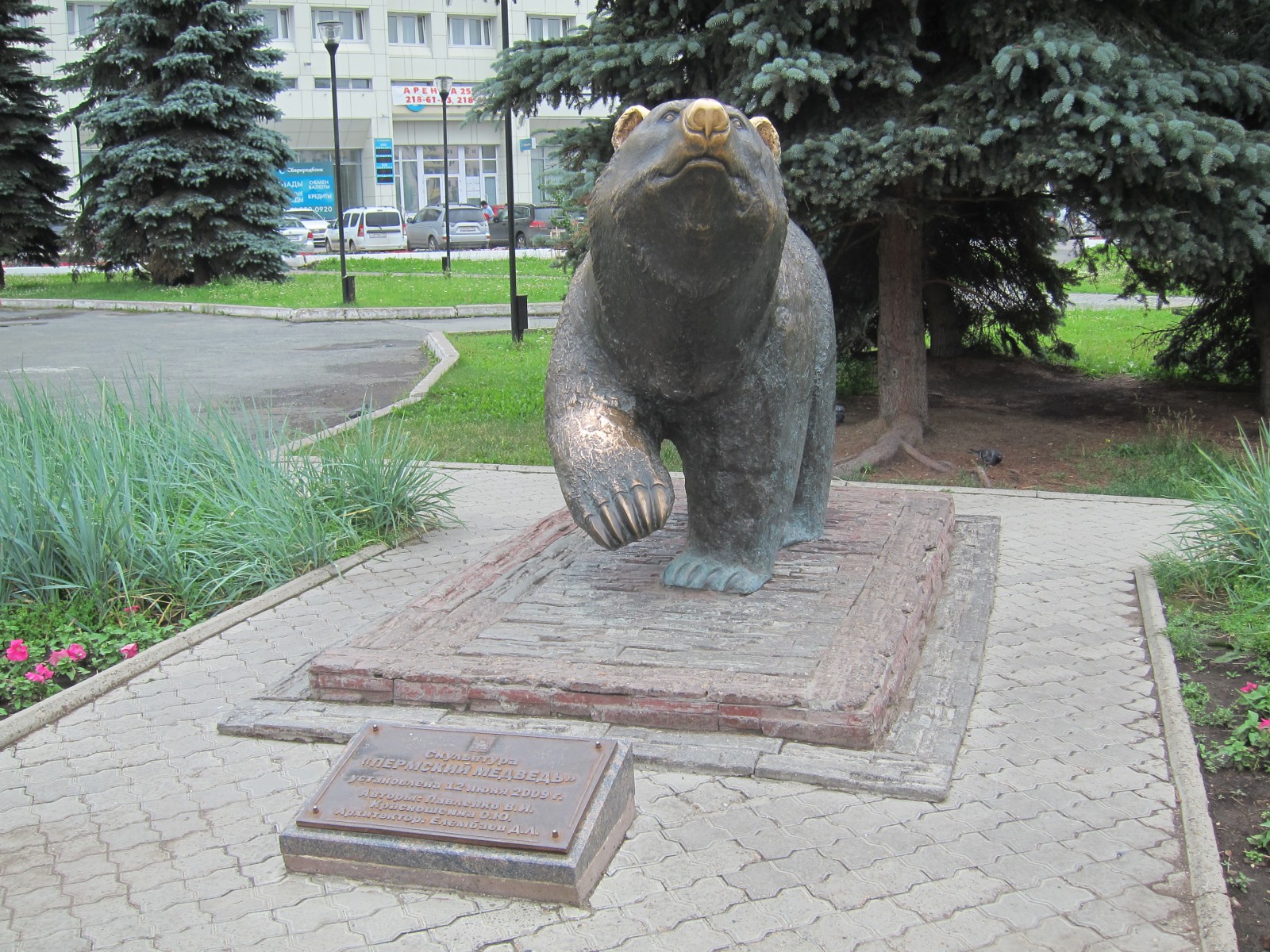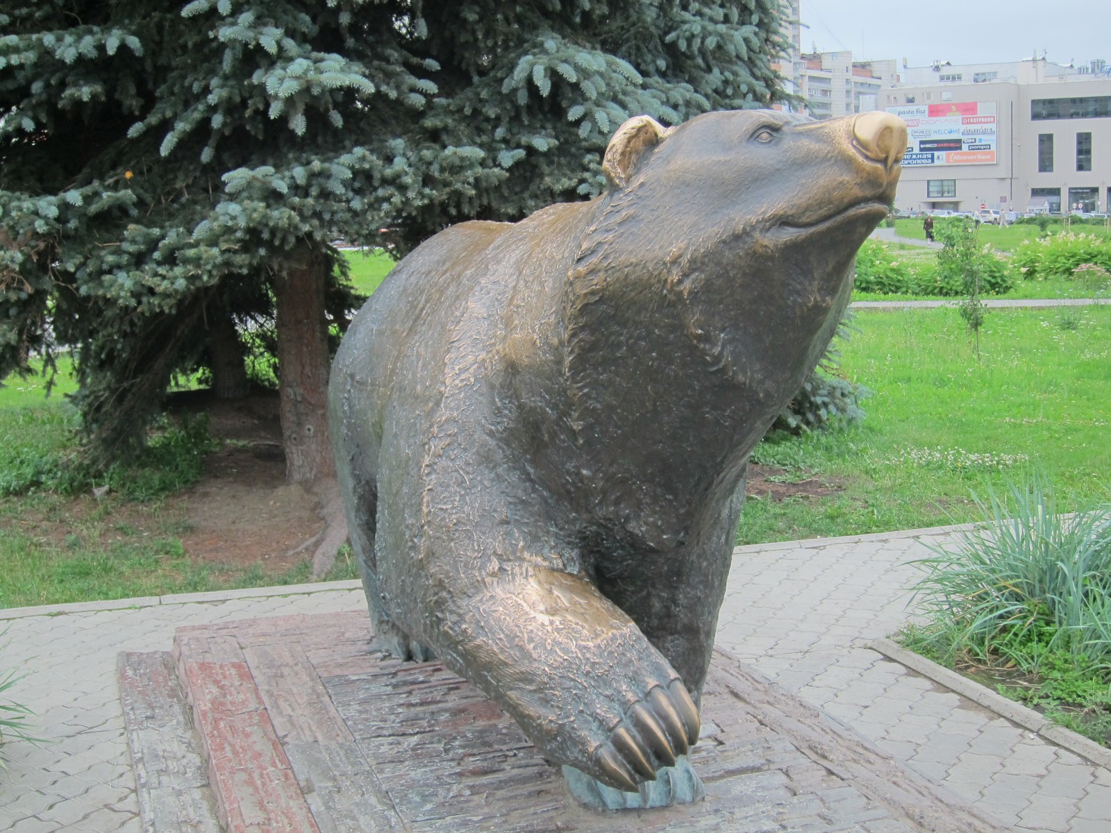 Монумент изготовлен из искусственного камня и занимает площадь около 3,5 м2. Масса медведя — 2,5 т, основания памятника — 1 т.