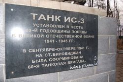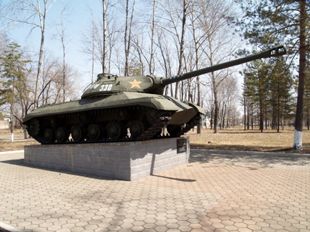 4. Описание объекта: В Биробиджане возведен монумент в честь памяти Великой Отечественной войны. Памятником стал 47 тонный отреставрированный танк «Иосиф Сталин» третьей модификации выпущенный в 1945 году. Боевую машину, успевшей пройти боевое крещение в боях с фашистами, доставили к месту установки памятника при помощи трейлера. Затем два мощных крана установили танк на невысокий оштукатуренный постамент.