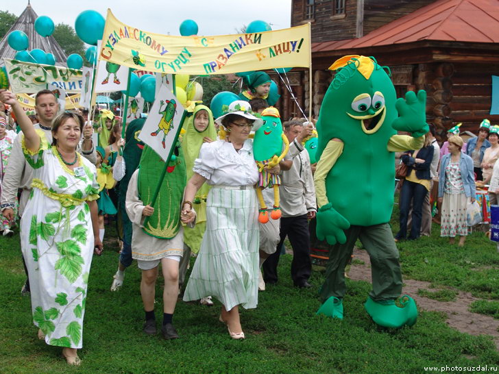 Отличительные признаки:уникальный фестиваль «Праздник Огурца» в Музее деревянного зодчества. увлекательные встречи с покровителями огуречников Святыми Фалалеем и Сидором, Евдокией и Иовом, а также с потомственными суздальскими огуречниками; театрализованное представление; выступление лучших фольклорных коллективов, дегустация огуречных разносолов, песни, пляски, забавы