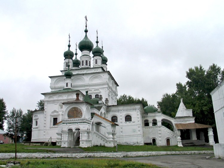 4.Описание: Собор пятиглавый, имеет квадратную столпообразную форму с уступом на самом верху выше карнизов. Обведен с трех сторон галереей-трапезной, с четвертой — алтарными полукружиями, соединенными друг с другом. В среднем полукружии устроен алтарь главного храма, рядом с ним — алтари приделов, иконостасы которых выходят в галерею, соединенную с главным храмом входными дверьми и арками. Из главного храма древний иконостас перенесен был в начале XIX века в Соликамский мужской монастырь. В соборе вместо него в 1824 году был устроен новый на средства купчихи Прасковьи Ивановны Лапиной-Ентальцевой. По преданию, он представлял собой уменьшенную копию иконостаса Казанского собора в Петербурге. Иконостасы в приделах оставались без изменений, были двухъярусные с витыми колоннами.
