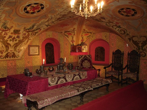 В довольно просторной комнате всего пять кресел. Этот вид мебели был еще редкостью в русском доме XVII в. Зато много традиционных лавок - они стоят вдоль стен и стола. Лавки по обычаю крыты сукном и бархатом, на них расставлены разнообразного вида и размера деревянные, обитые прорезным железом ларцы с расписными изнутри крышками. Использовались они для хранения необходимых в повседневном обиходе вещей. У стены поставец, имеющий вид горки с уступами: на нем расставлена столовая посуда.