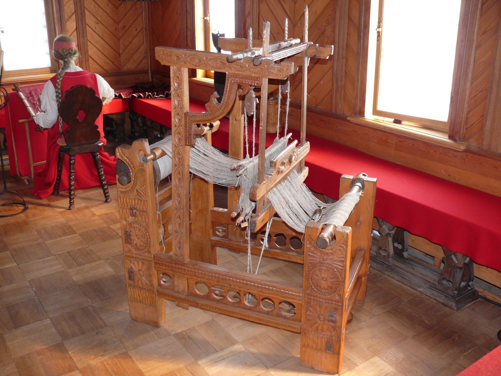 Из сеней - вход в женскую комнату, светелку (имеет окна с трех сторон). Расположение женской комнаты за сенями, в изолированной части дома, в условиях существующей планировки, лучше всего передает характерные особенности женского быта XVII в. Внешняя обособленность светлицы соответствовала тому положению, которое занимала в семье и обществе женщина, она проводила почти весь день в своей комнате, руководя через доверенных слуг домашним хозяйством, из дому выезжала очень редко - в церковь и к родным. Единственным доступным видом ее развлечений было шитье, оно заполняло досуг, служило источником творческих радостей. Основную обстановку интерьера светлицы составляют предметы, связанные с шитьем: пяльцы, в них образцы орнаментального шитья, сундук-укладка с шитьем, на стене - шитая пелена с изображением Христа во гробе (Плащаница), общий характер и манера рисунка которой воспроизводят лучшие традиции иконописи.